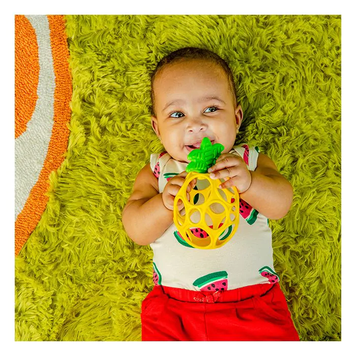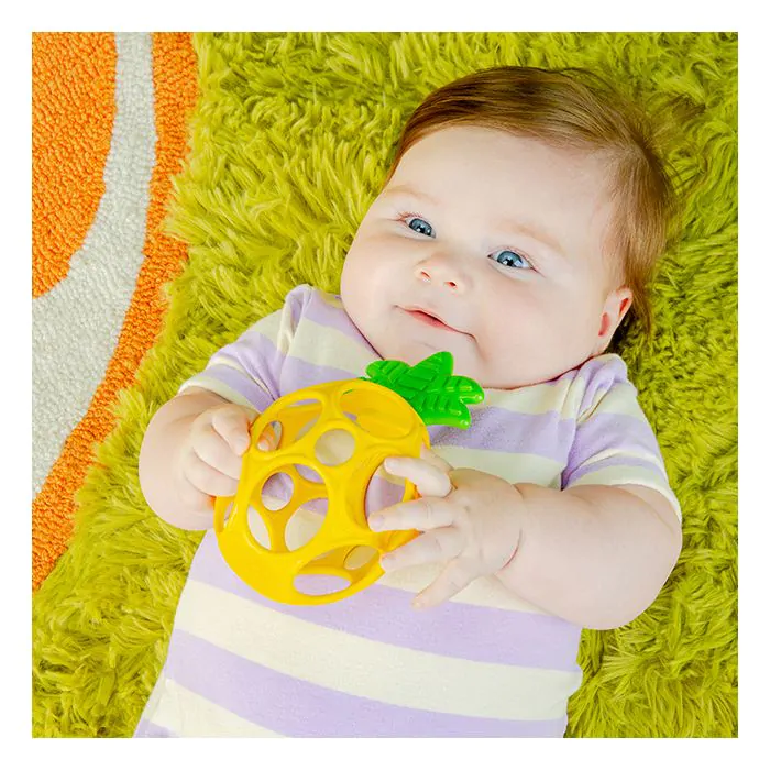 - Gemakkelijk vast te pakken appelspeelgoed gemaakt van de flexibele, duurzame Oball-technologie van Bright Starts met vingergaten voor kleine handjes om vast te houden en mee te spelen