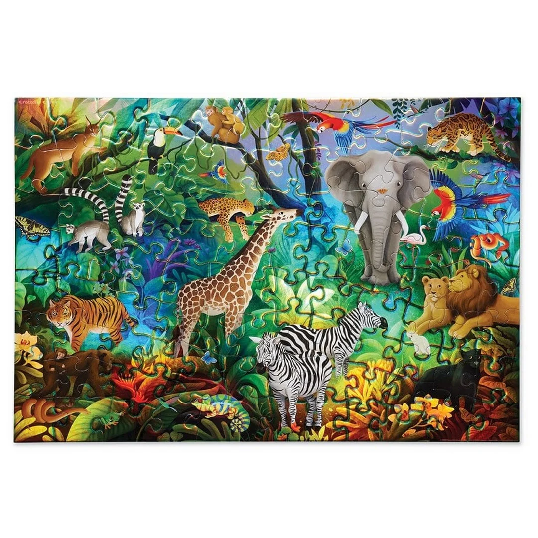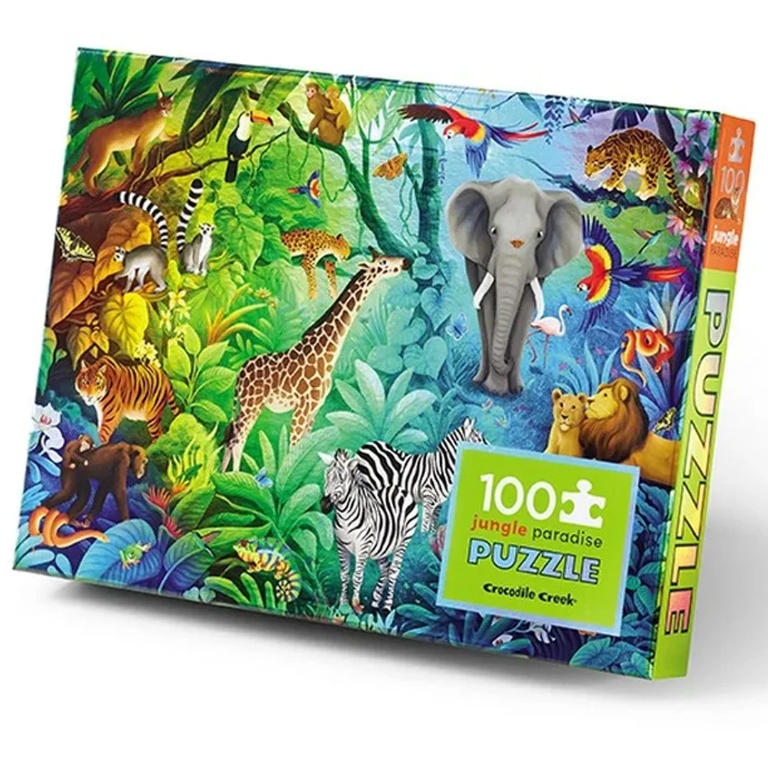 Ga op avontuur in een tropisch oerwoud met deze sprankelende holografische puzzel van 100 stukjes! De kleurrijke, gedetailleerde illustraties en glinsterende folieaccenten maken van puzzelen een magische belevenis. Ideaal voor jonge puzzelaars die spelenderwijs hun concentratie, fijne motoriek en probleemoplossend vermogen willen versterken.