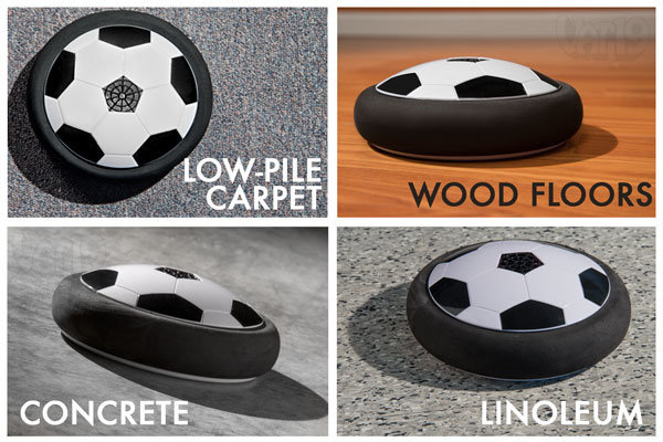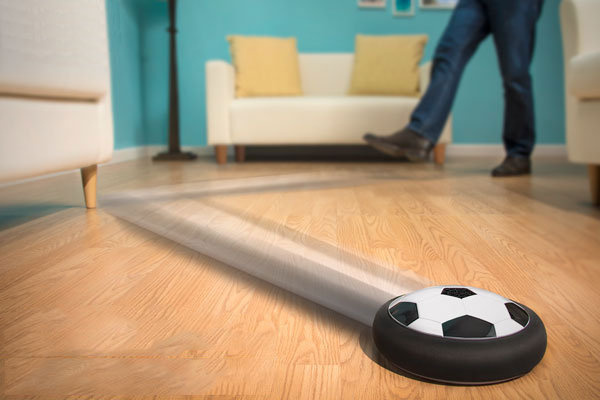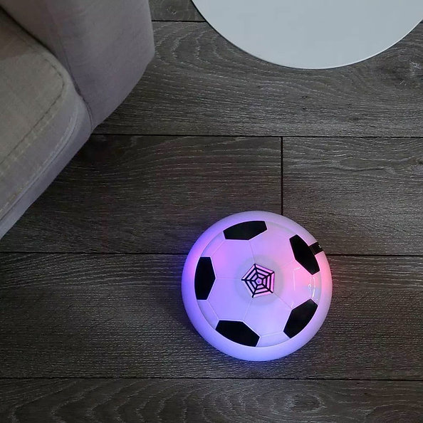 Heb je ooit binnenshuis willen voetballen? Met de Hovering Football kan dat! Deze kleine gadget is perfect voor elke voetbalfanaat, plaats gewoon batterijen, plaats hem op een vlakke, gladde vloer en je kunt aan de slag! De ingebouwde bumper beschermt meubels en muren, terwijl het luchtkussen hem soepel over de vloer laat glijden. Inclusief 4 kegels voor gebruik als doelen of trainingsmarkeringen.