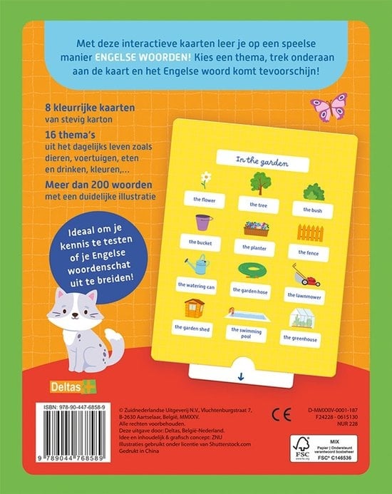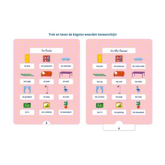 De doos bevat 8 kleurrijke kaarten van stevig karton waarop een heleboel tekeningen en woorden in het Nederlands staan. Op elke kaart staan woorden rond een thema uit het dagelijks leven. Kies een thema, trek onderaan aan de kaart en de Engelse woorden komen tevoorschijn! Ideaal om eenvoudige woorden in te oefenen!