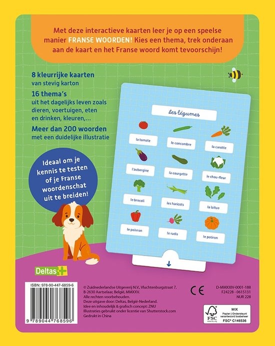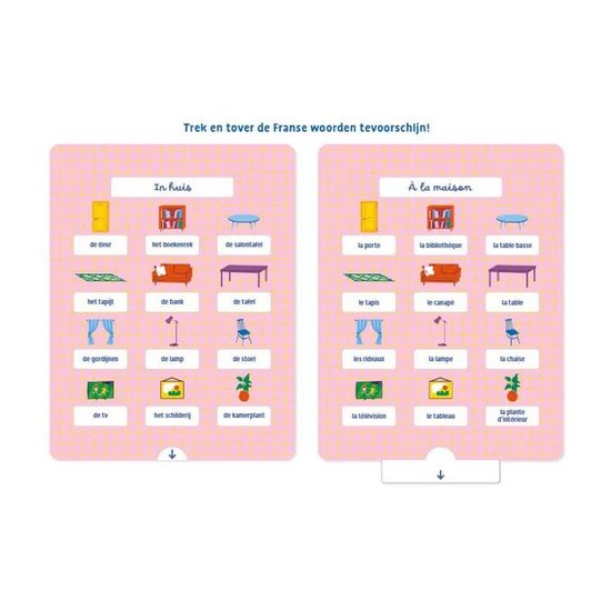 De doos bevat 8 kleurrijke kaarten van stevig karton waarop een heleboel tekeningen en woorden in het Nederlands staan. Op elke kaart staan woorden rond een thema uit het dagelijks leven. Kies een thema, trek onderaan aan de kaart en de Franse woorden komen tevoorschijn! Ideaal om eenvoudige woorden in te oefenen!