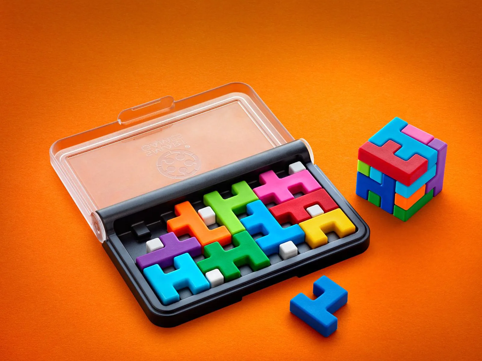 Vul het spelbord in 2D of bouw een perfecte kubus in 3D. De softtouch puzzelstukken maken deze breinbreker extra tastbaar en verrassend.