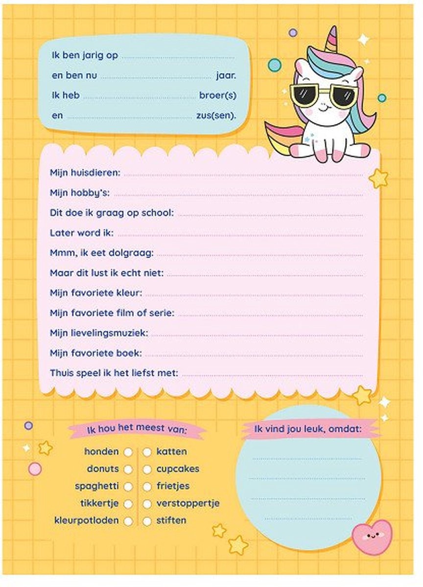 Laat je vrienden, vriendinnen en klasgenoten iets over zichzelf vertellen in dit superschattige kawaii vriendenboek. Waar wonen ze? Wat is hun favoriete film of serie? Welke hobby's hebben ze? Je kan je vrienden zelfs een leuke tekening laten inkleuren! Als je dit boek goed bewaart, wordt het later een van je mooiste herinneringen aan al je vriendjes en klasgenootjes.