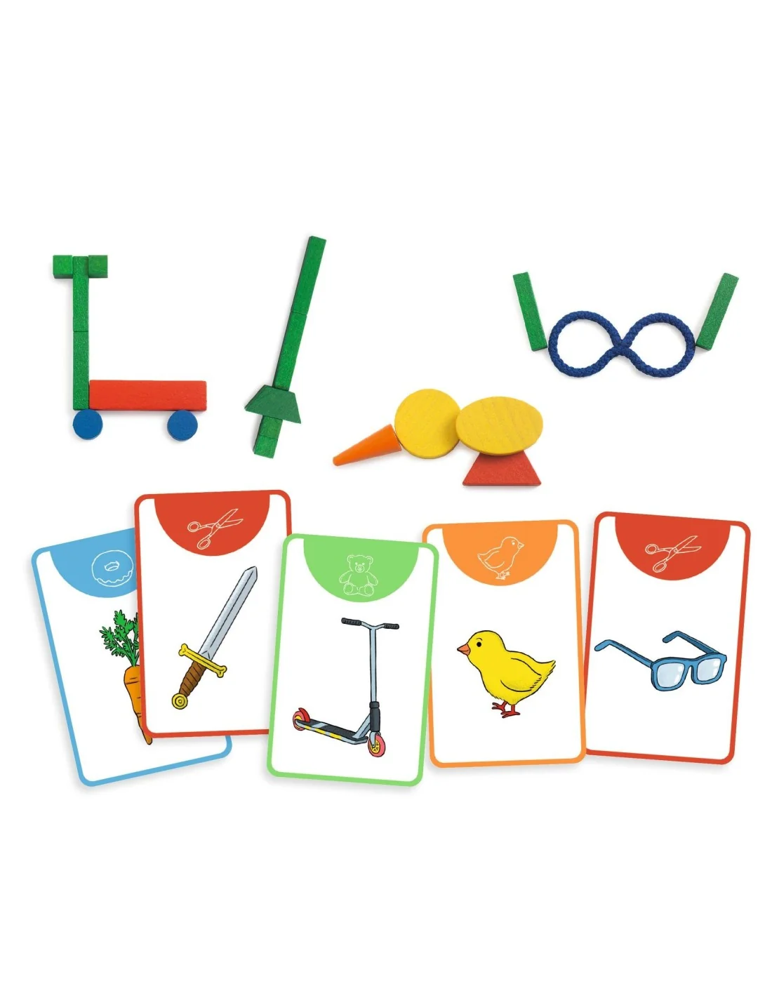 Laat andere spelers verschillende elementen raden (dieren, voorwerpen, planten) door gebruik te maken van verschillende houten vormen en een stuk touw. Je verbeelding wordt voortdurend op de proef gesteld, en elke ronde belooft zijn portie verrassingen.