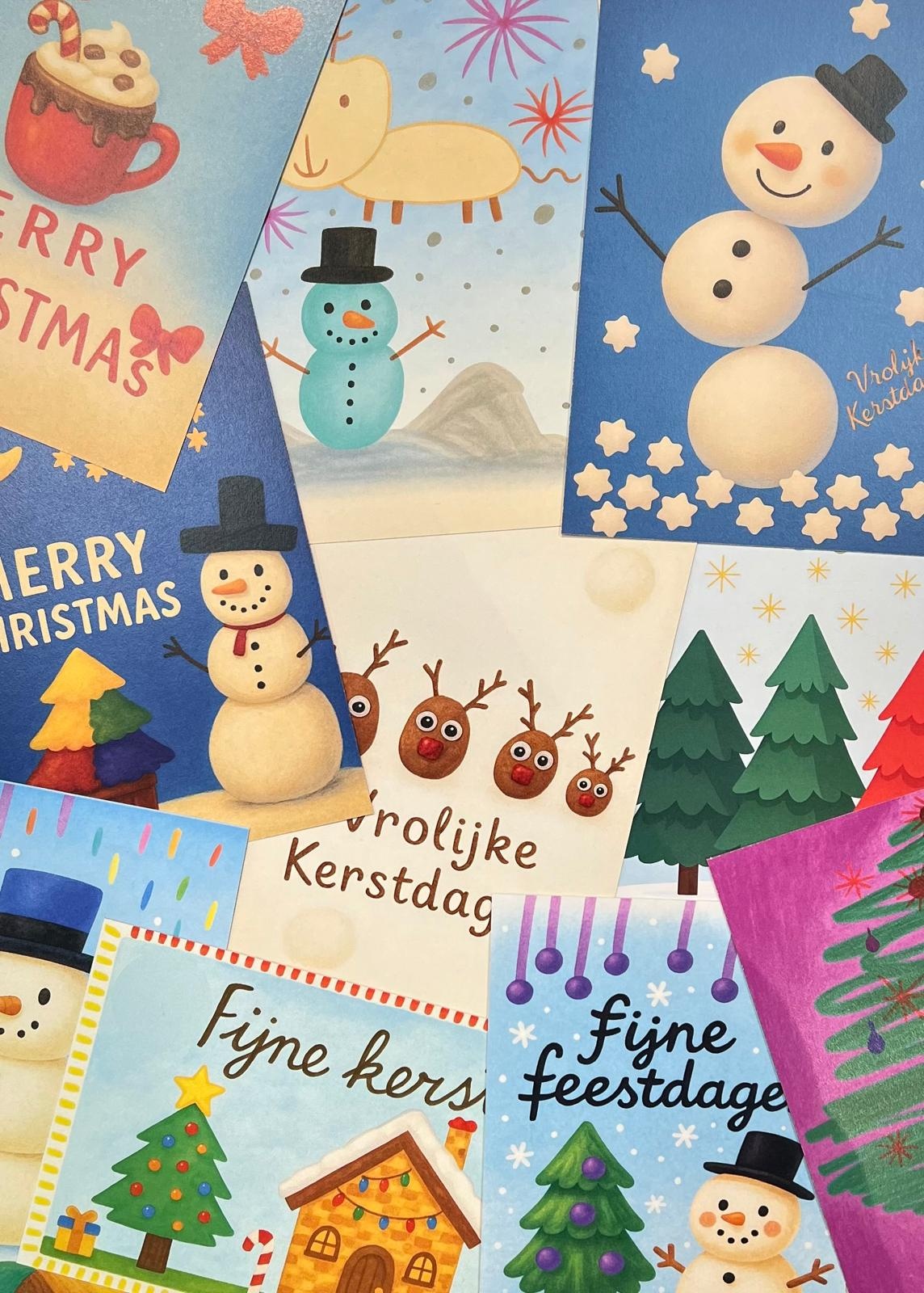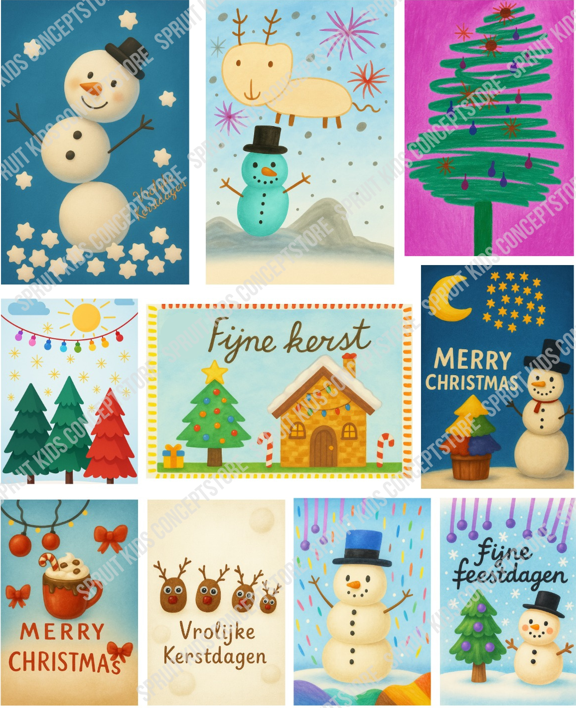Deze set van 10 feestelijke kerstkaarten is ontworpen door kinderen, voor kinderen. De kaarten zijn lief, kleurrijk en vol winterse fantasie - precies zoals alleen kinderen dat kunnen. Denk aan vrolijke kerstboompjes, blije sneeuwpoppen en lieve kerstwensen.
