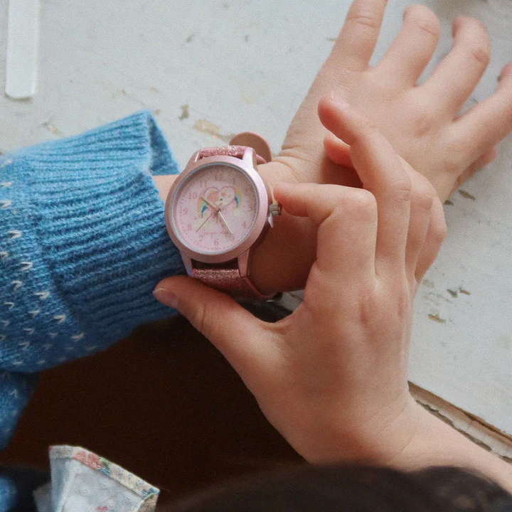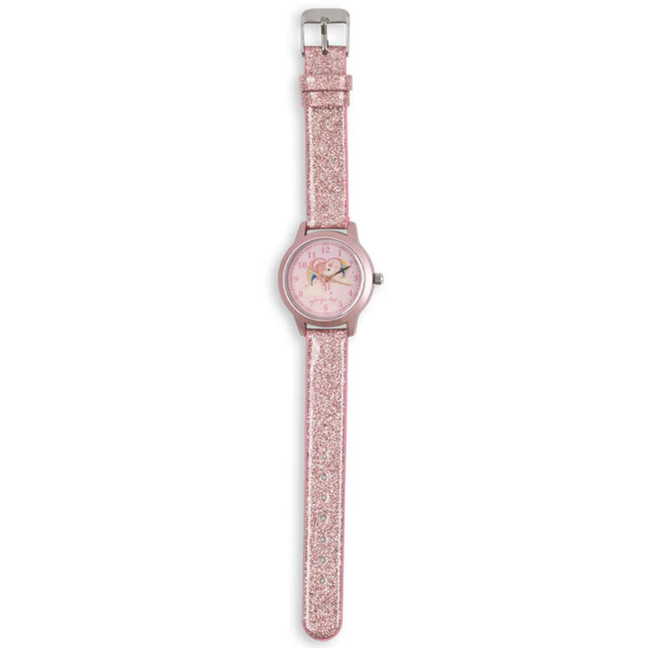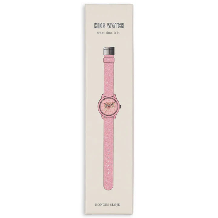 Droom lekker weg met dit schitterende horloge van Konges Sløjd. Gemaakt voor fantasierijke kids die graag willen weten hoe laat het is. Het horloge heeft een glitter-armband in PU‑materiaal, een verstelbare stalen gesp én een duidelijke wijzerplaat om spelenderwijs klokkijken te leren.