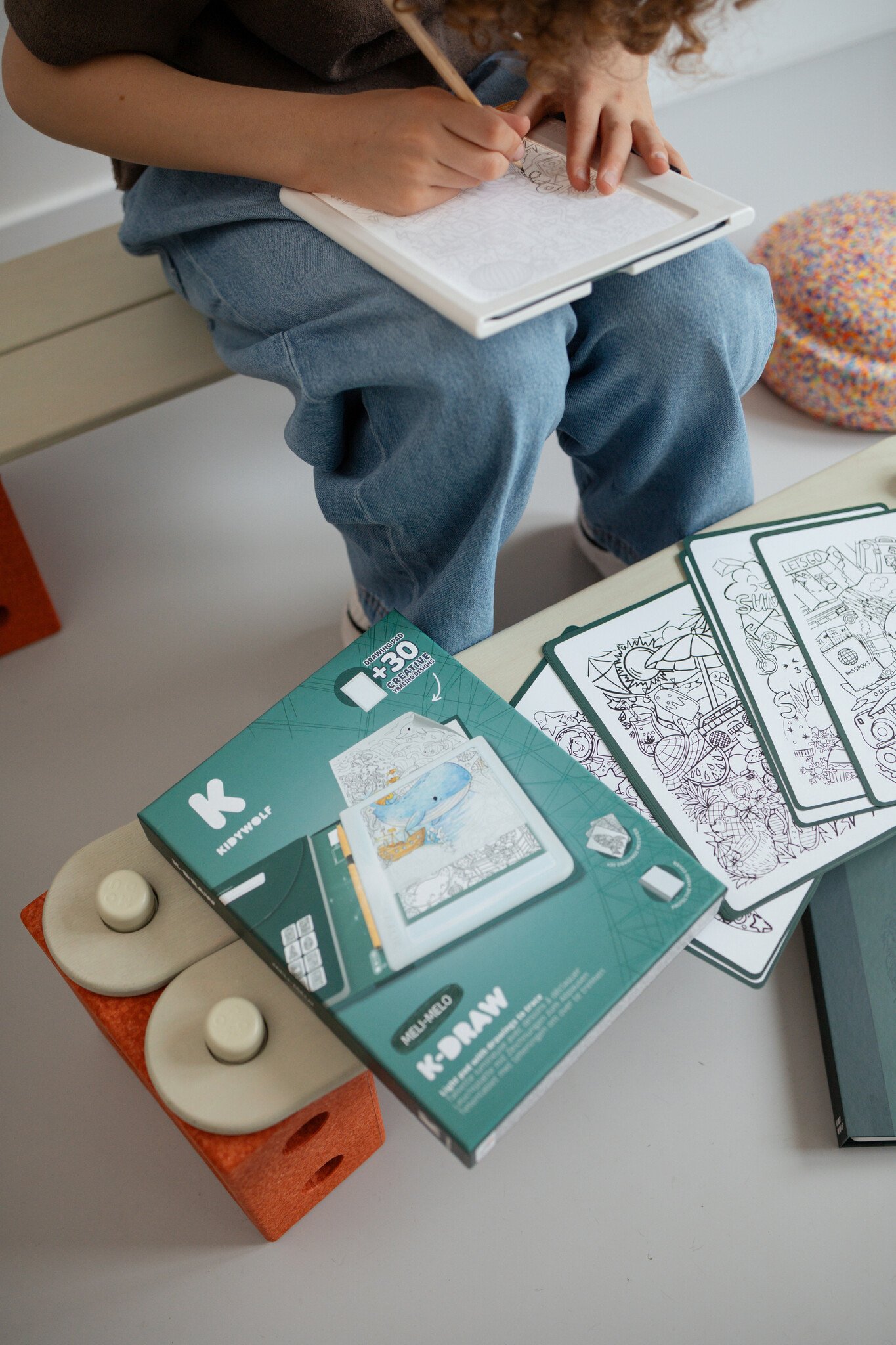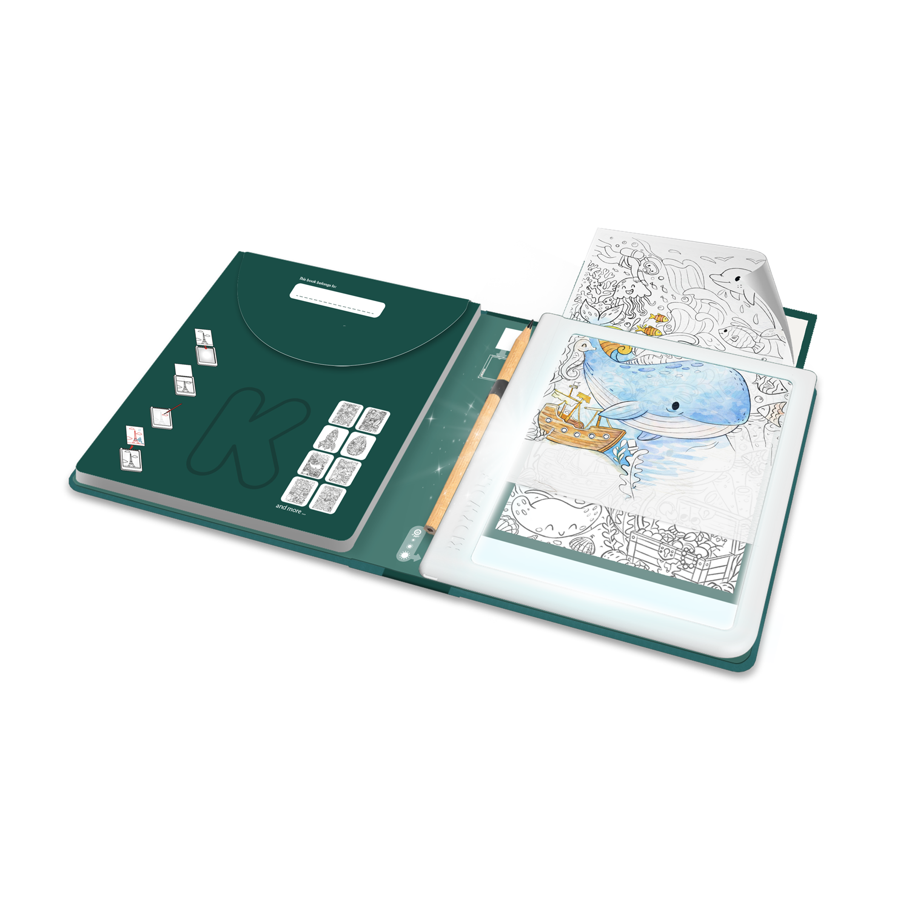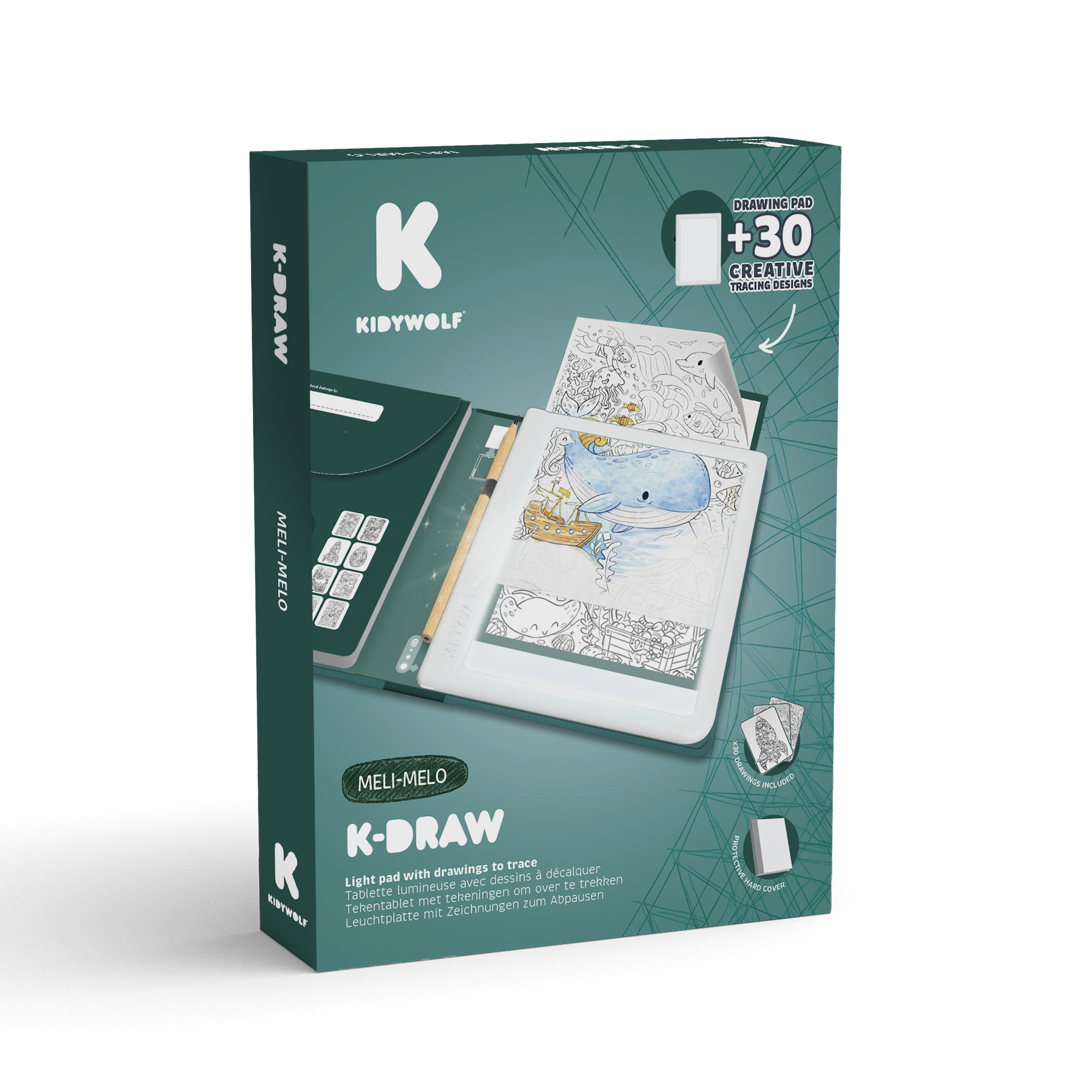 KIDYDRAW-PAD is een lichtgevend tablet dat is geïntegreerd is in een magnetisch boekje, met 30 illustraties die met behulp van een potlood op wit papier kunnen worden overgetrokken. Het is een educatief spel, zonder scherm, dat kinderen stap voor stap begeleidt bij het ontwikkelen van hun precisie, concentratie en zelfvertrouwen. Met oplaadbare batterij.