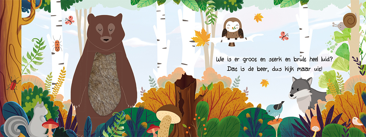 Welke dieren leven er in het bos? In dit boekje leer je ze kennen, maar kun je ze ook aaien! Voel maar eens aan de vacht van het hert, de stekels van een egel of de staart van de eekhoorn. Stevig boekje voorzien van mooie illustraties en stofjes en lieve rijmpjes om voor te lezen maar waarmee je kindje ook zelf kan spelen en ontdekken.
