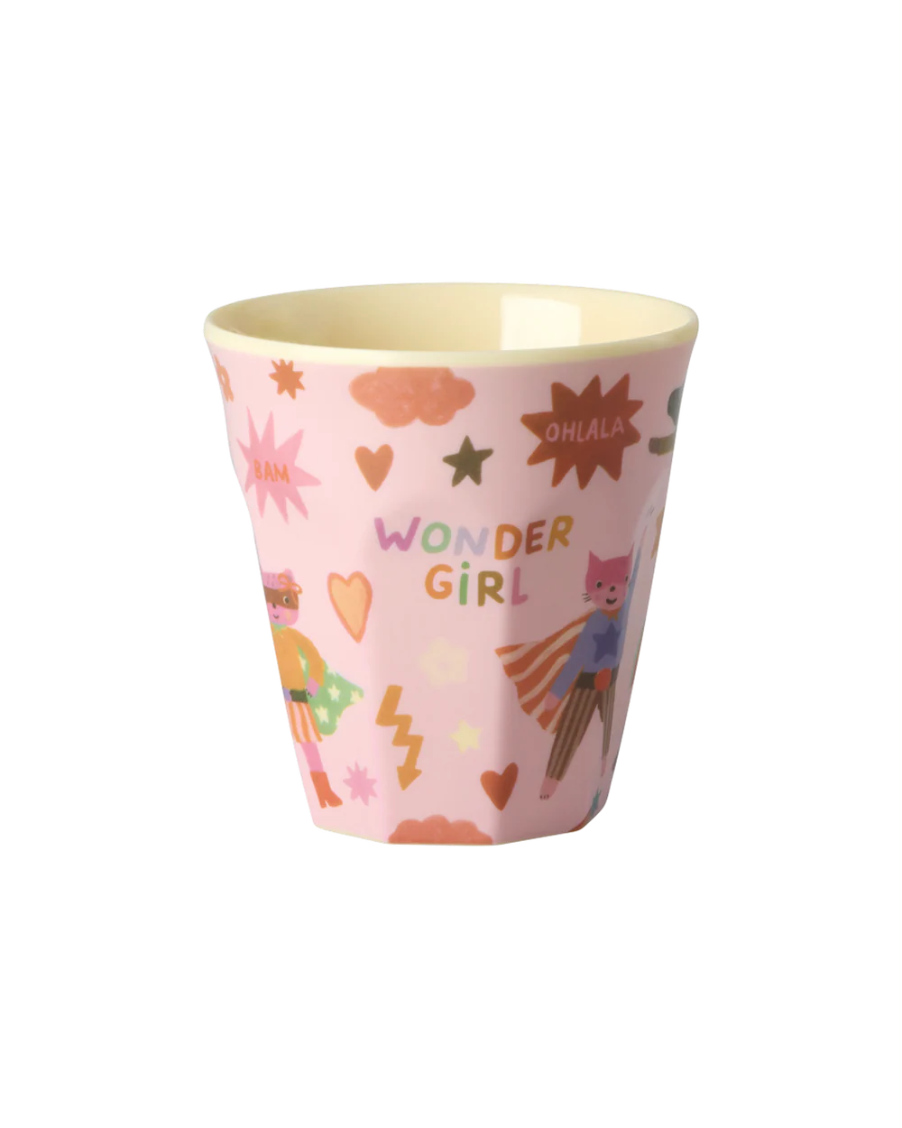 Het populaire melamine bekertje voor kinderen - met een heldenthema print in roze tinten. Melamine is duurzaam en ideaal voor dagelijks gebruik, omdat het sterk en makkelijk schoon te maken is. Het materiaal zorgt ervoor dat het bekertje voor van alles en nog wat te gebruiken is - als drinkbeker, voor hapjes of kleine spulletjes.