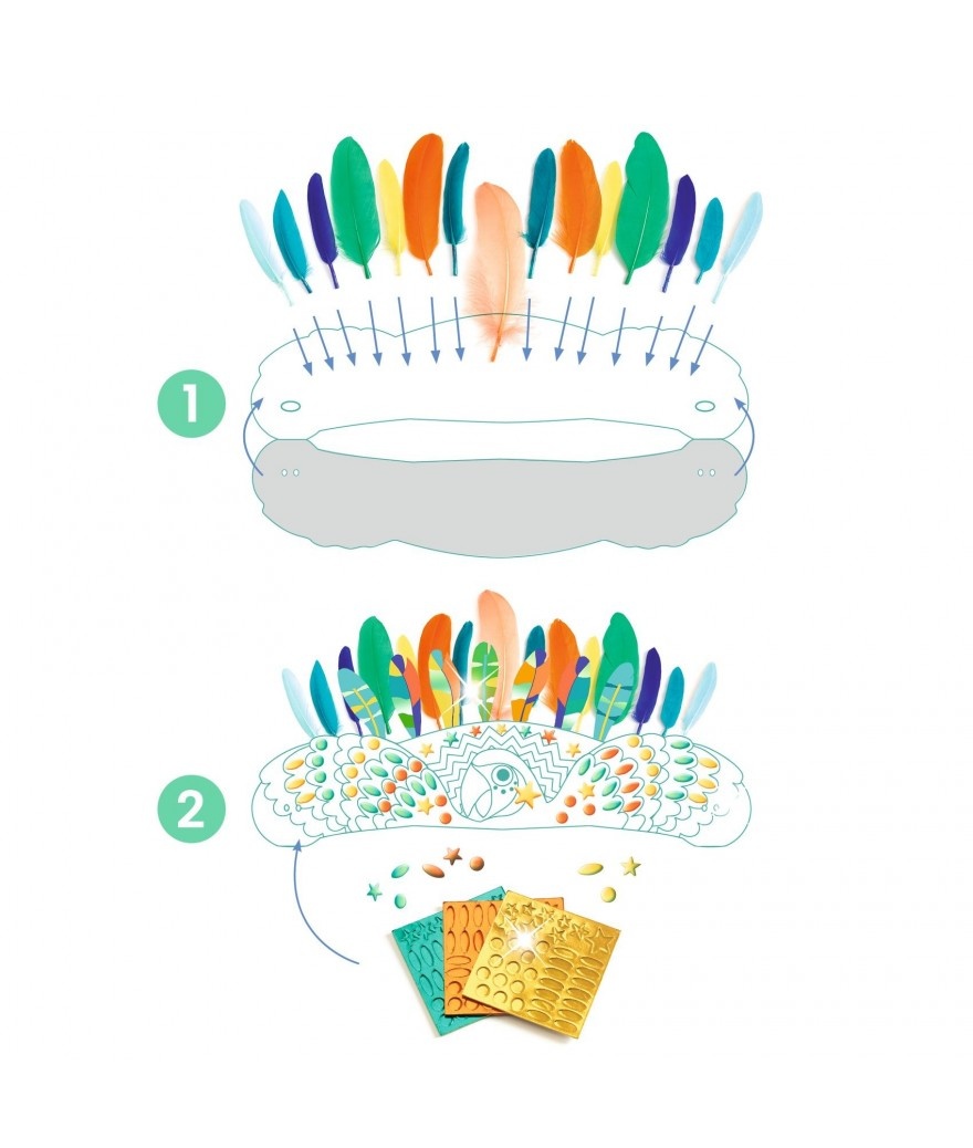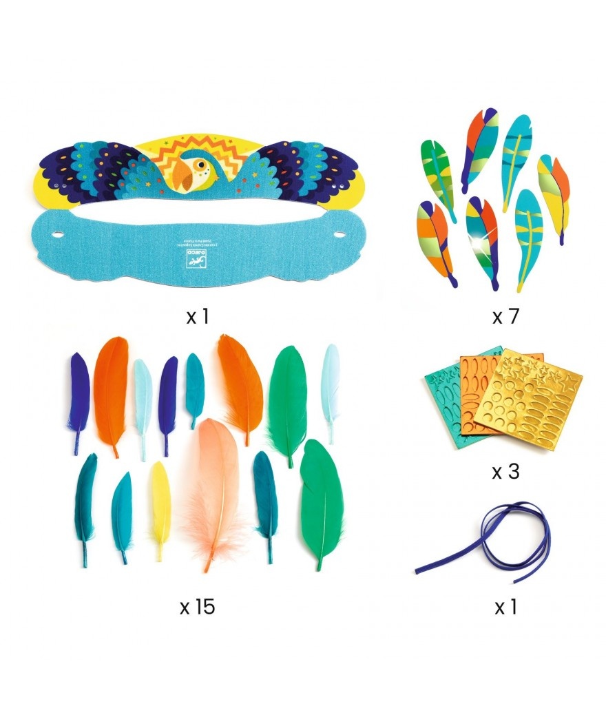 Een creatieve set om een tropisch hoofddeksel te creëren, door het te versieren met gekleurde veren en stickers. Het stoffen hoofddeksel kan worden geopend en is voorzien van een zelfklevende strook zodat je kind de gekleurde veren op het hoofddeksel kan plakken. Zodra het hoofddeksel wordt gesloten, kan de kroon worden afgewerkt met metallic stickers, door de geprinte kleurvoorschriften te volgen, om de mooiste, feestelijke kroon te creëren, die het Carnaval van Rio de Janeiro waardig is!