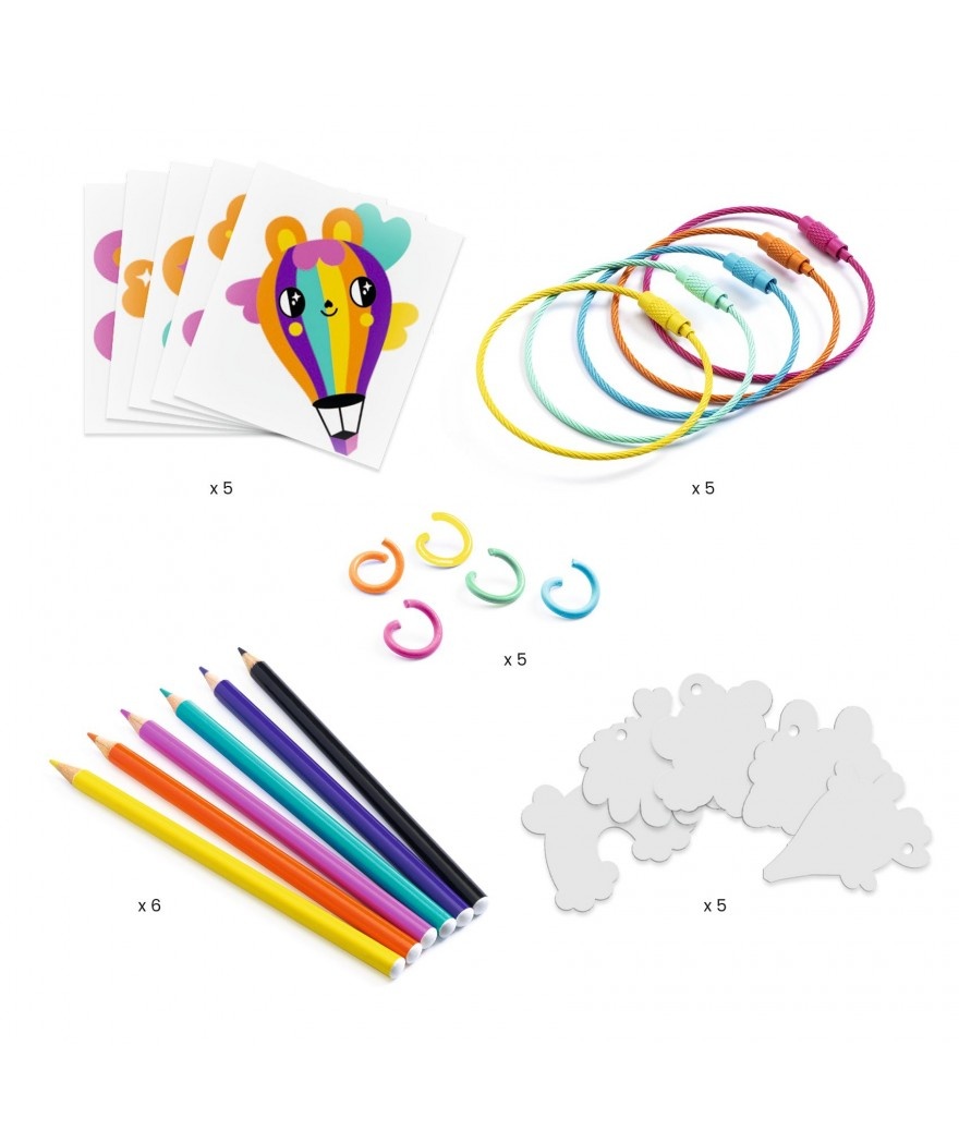 Met deze set kan het kind vijf sleutelhangers met schattige Kawai figuurtjes maken door gebruik te maken van krimpfolie! Het kind legt het model onder de overeenkomstige doorzichtige plastic vorm en maakt het model na met de kleurpotloden. Eenmaal in de oven gebeurt er iets magisch: de stukjes krimpen in een paar seconden en het plastic wordt stijf en dik. Nu hoef je alleen nog maar je ontwerpen aan de gekleurde ringen te hangen om er mooie sleutelhangers van te maken.