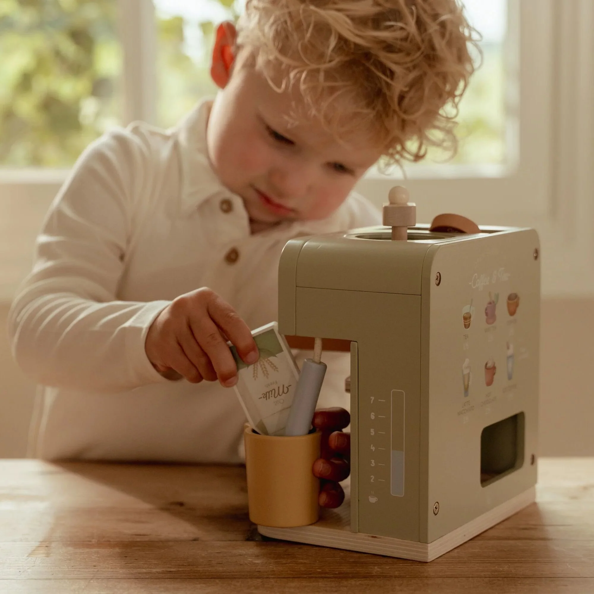 Tijd voor een lekker kopje koffie of thee! Met dit houten koffiezetapparaat kunnen kleine barista’s zelf bonen malen, koffiecapsules plaatsen en hun drankje roeren met een lepeltje. De set bevat twee kopjes, twee lepeltjes, een melkkan, melkpakjes en zelfs cappuccino-sjablonen voor een echte koffie-ervaring. Op de achterkant van het apparaat staan vrolijke illustraties. Perfect te combineren met de speelgoed koffiehoek voor nog meer speelplezier. Wat mag het zijn vandaag: koffie of thee?