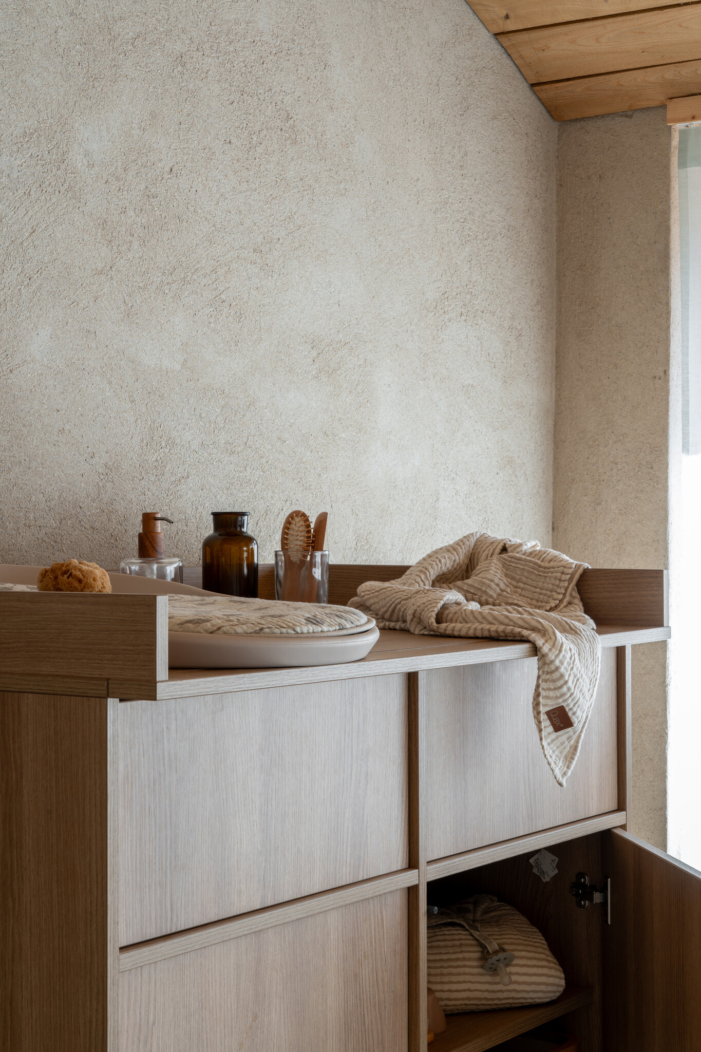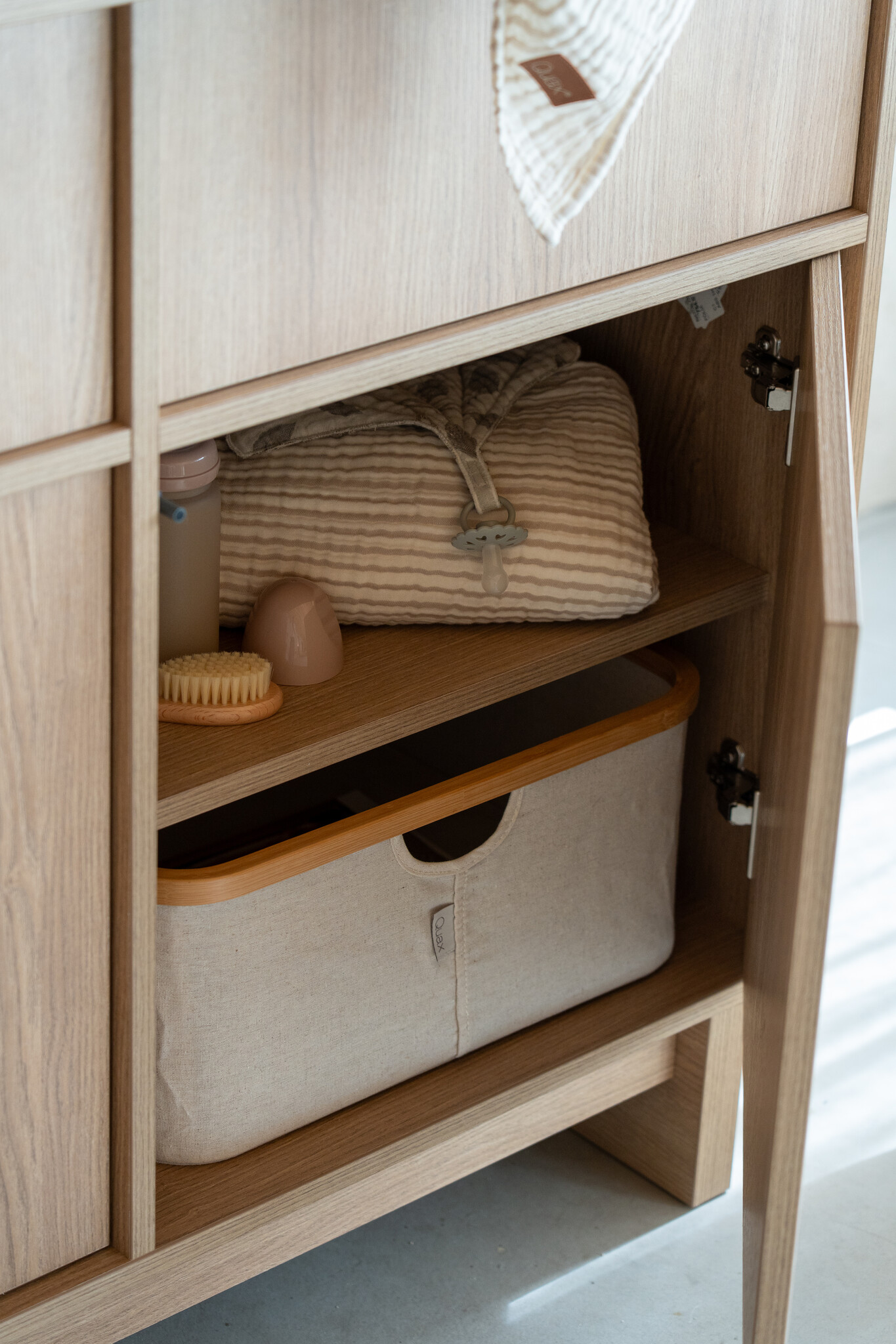 Wat deze commode écht bijzonder maakt, is haar modulaire karakter. Dankzij de compatibiliteit met de apart verkrijgbare XL-extensie transformeer je haar moeiteloos tot een ruime luiertafel. Voeg je in een latere fase de bijpassende opbergmodule met open vakjes toe, dan ontstaat er een overzichtelijke kast waarin je favoriete verzorgingsproducten of accessoires mooi tot hun recht komen – perfect voor in de babykamer, maar net zo stijlvol in een leefruimte.
