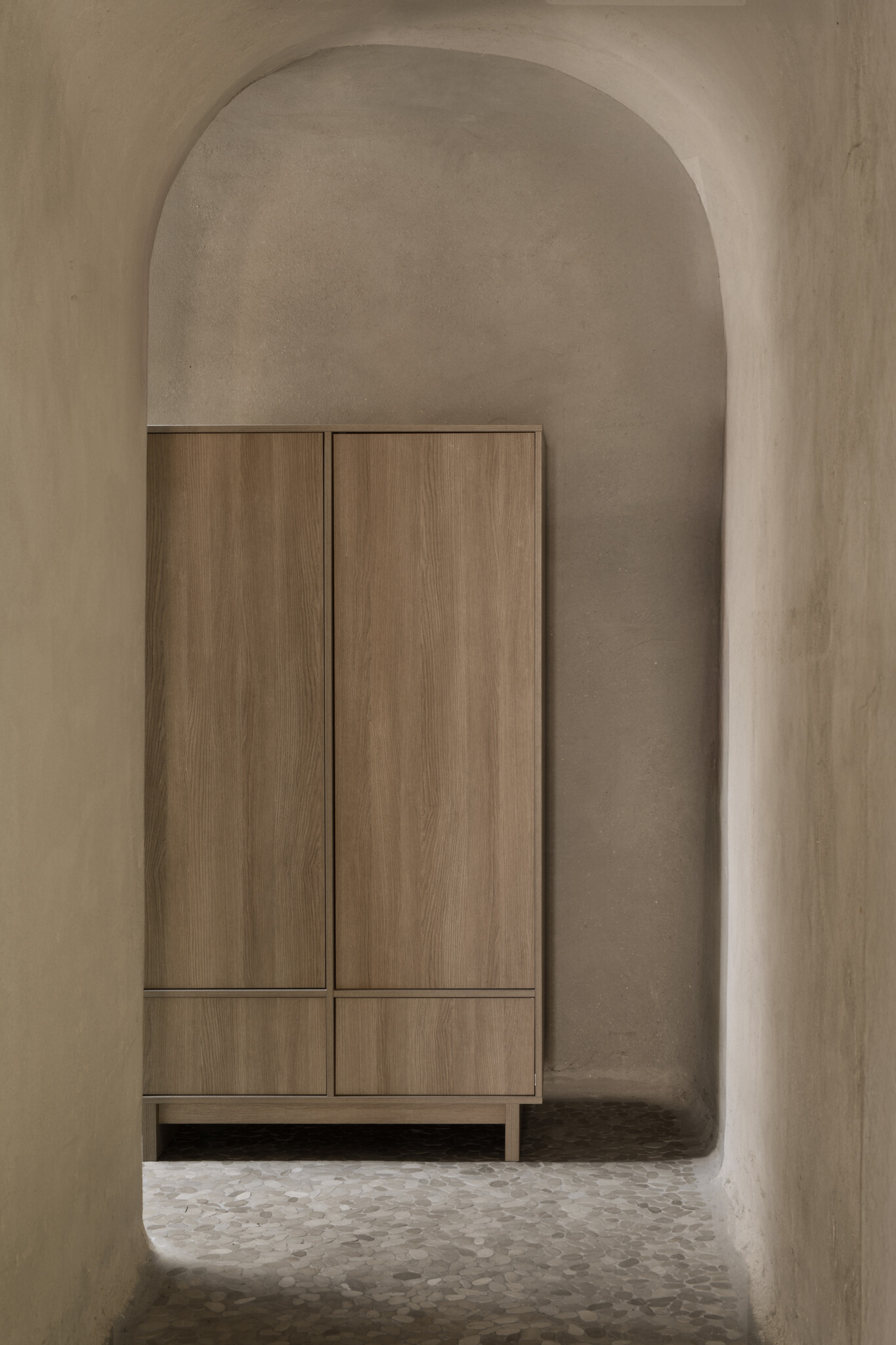 De Kyo tweedeurskast is een harmonieuze mix van vorm en functie, ontworpen in dezelfde strakke lijnen en warme houttinten als de rest van de collectie. Het ingetogen ontwerp met onzichtbare grepen en push-to-open systeem zorgt voor een serene, opgeruimde uitstraling.