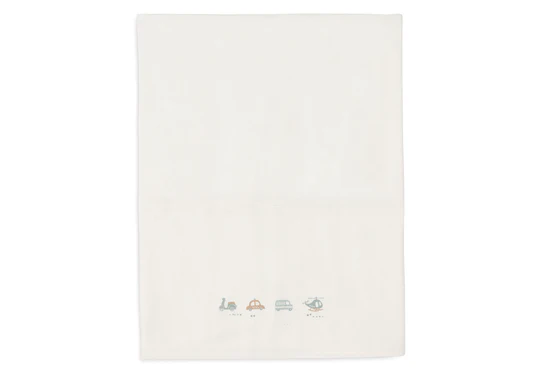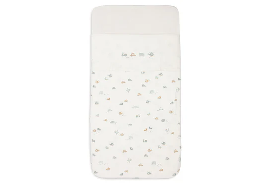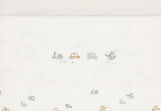 Laat je kleintje heerlijk dromen onder dit prachtige lakentje uit het On The Go thema! Dit ivoorkleurige lakentje heeft een speelse print met autootjes, een scooter en een helikopter op de omgevouwen rand.