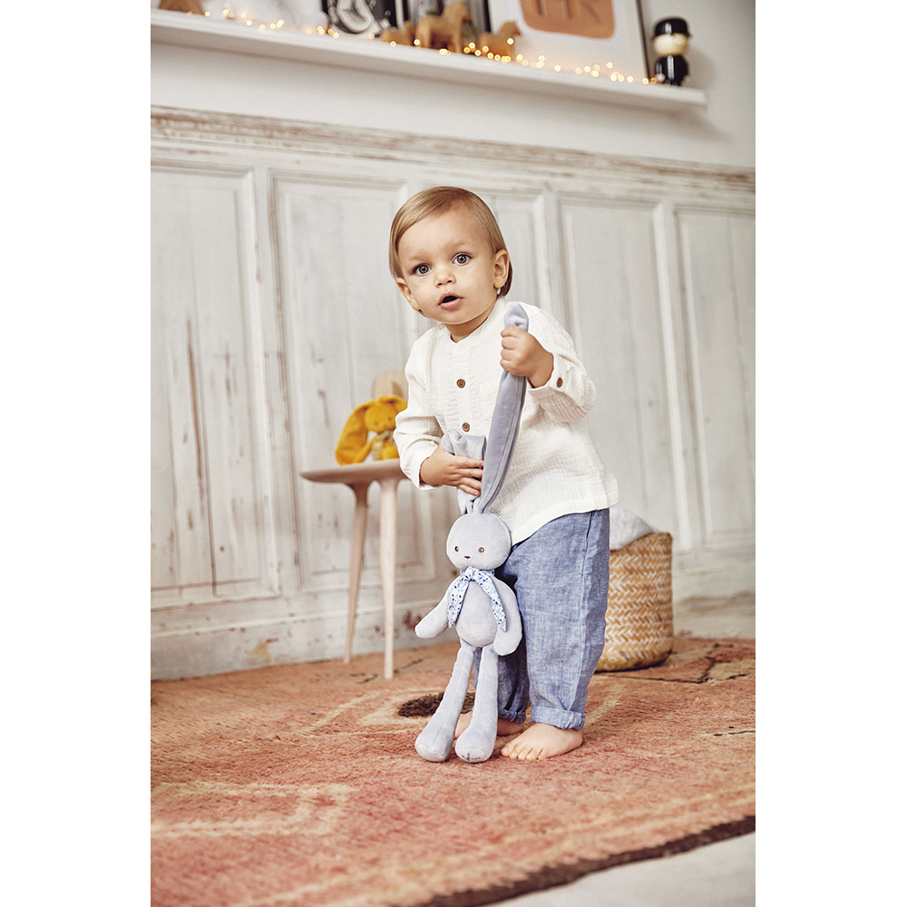 Dit vrolijk klein konijntje heeft zulke lange oren dat je hem overal kunt vasthaken om hem te bewaren en nooit te verliezen. Je kunt alles met hem doen: op je hoofd staan, schommelen, ophangen aan de wasdraad. Met zijn lange oren omhult hij de baby met tedere knuffels en deelt hartelijke momenten met hen. Machinewasbaar. Geleverd in een mooie geschenkdoos met ruimte voor een persoonlijk bericht onder het deksel.