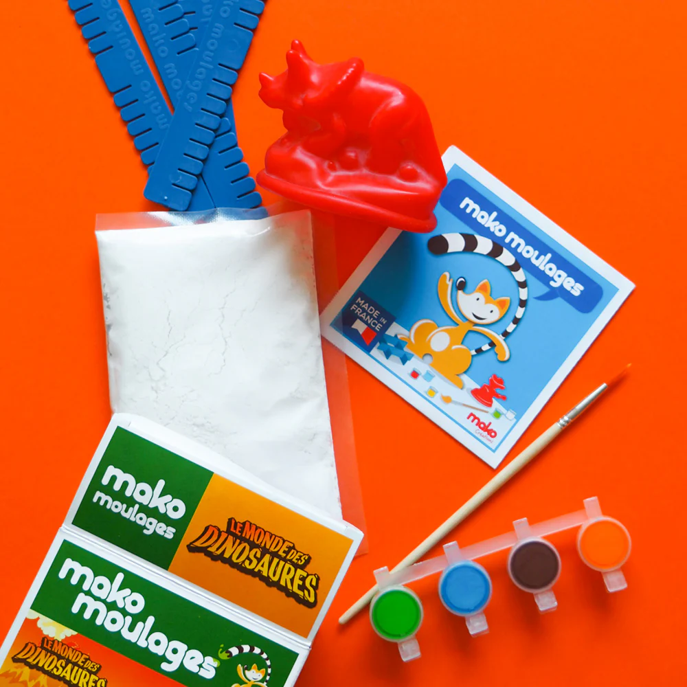 Met het Mako Moulages – Triceratops creatief-pakket maak je zelf een krachtige triceratops van gips. Giet het gips in de latexmal, laat het uitharden en schilder de dino daarna in levendige kleuren. Een avontuurlijk knutselproject voor jonge paleontologen!