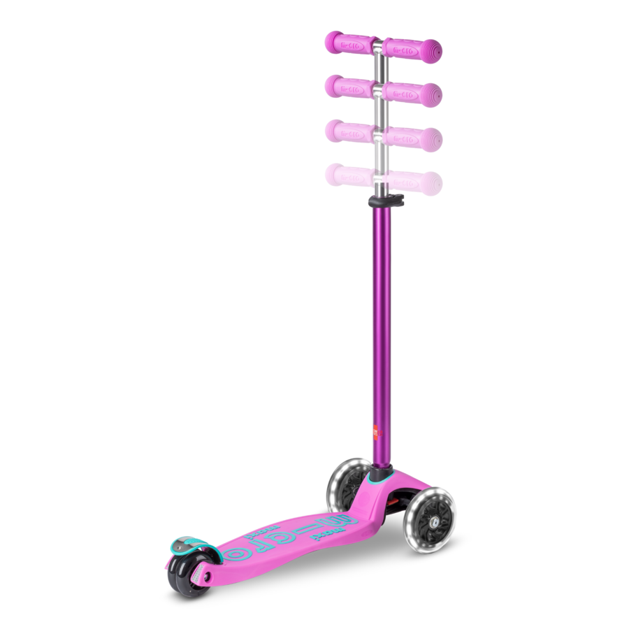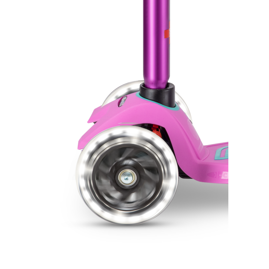 De lavendelkleurige Maxi Micro Deluxe step met LED-lampjes in de wielen biedt extra veiligheid doordat kinderen beter zichtbaar zijn. Bovendien zijn de LED-wielen een geweldige toevoeging waar kinderen dol op zijn. Deze wielen worden door beweging geactiveerd en lichten wit op, waardoor het hele wiel in het donker een helder wit schijnsel geeft. Het is aan te raden om dit effect aan klanten te demonstreren in een donkere ruimte voor de beste indruk.