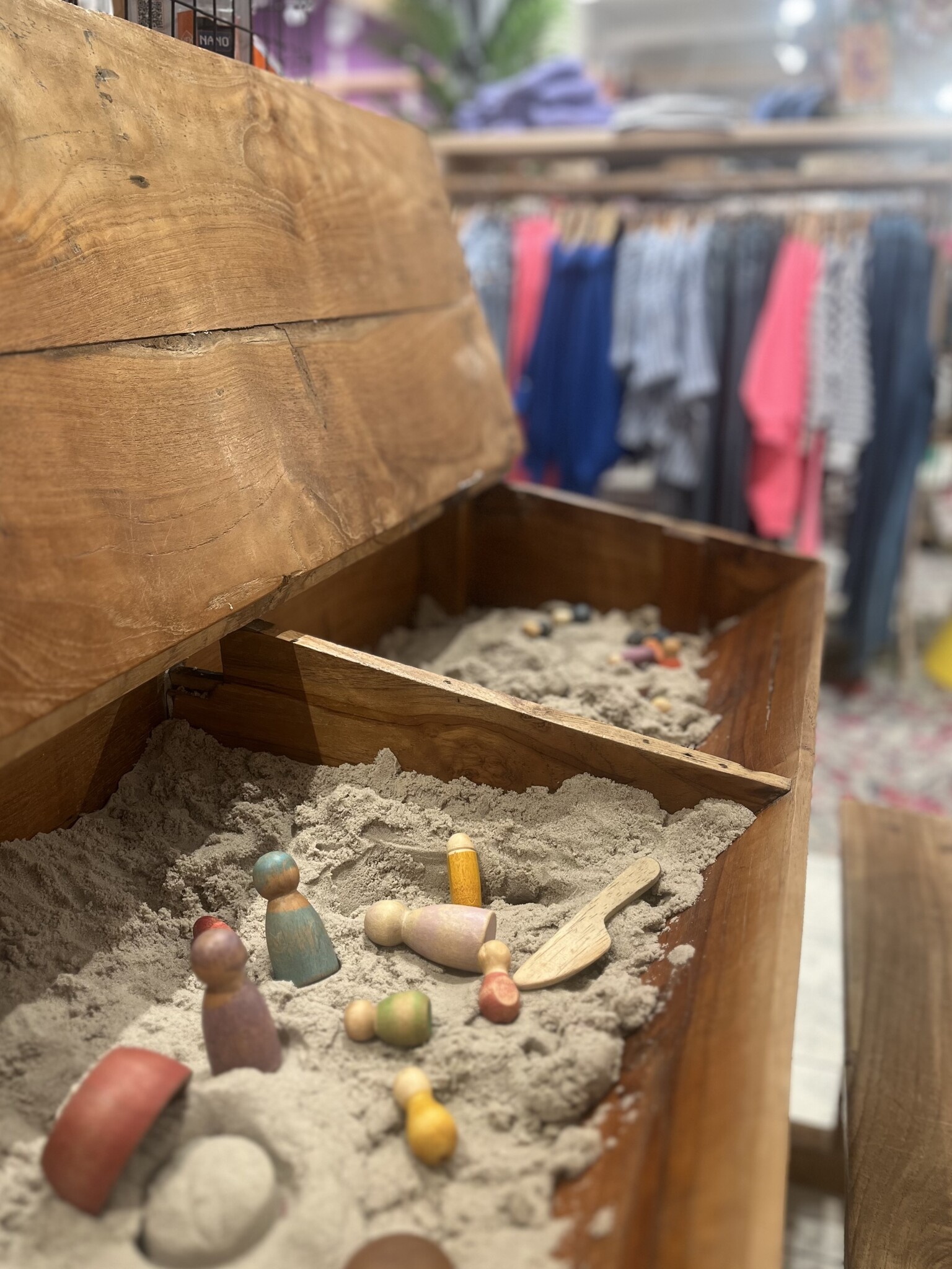 Wij helpen je graag met het vinden van het perfecte items! Terwijl jij lekker rondkijkt in onze winkel, zal je kind zich ongetwijfeld vermaken aan bijvoorbeeld onze tafel met 'magisch zand' en met ons houten winkelhondje (sorry als ze hierdoor niet mee naar huis willen..).