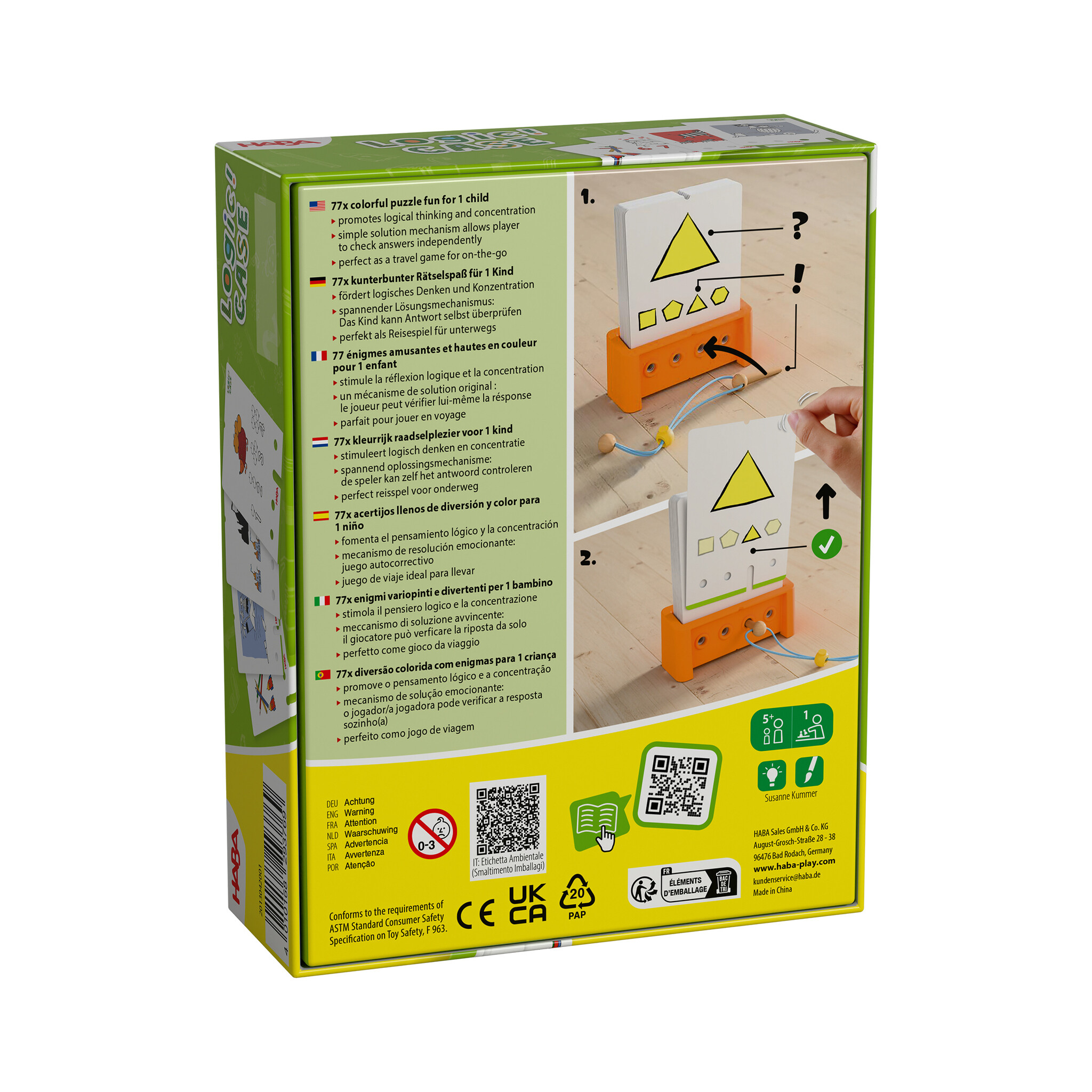 De populaire Logic! CASE-puzzelsets in een nieuw jasje: het beproefde spelprincipe wordt duidelijker uitgelegd en is sneller te begrijpen, de verpakking is steviger en van hogere kwaliteit, en de puzzelkaarten zijn opnieuw samengesteld. Het kind moet zoals gewoonlijk de meest uiteenlopende opdrachten ontcijferen en oplossen. Een houten stokje dient om op een speelse manier te controleren of de oplossing klopt: alleen als de kaart eruit getrokken kan worden, is het antwoord correct. Dit versterkt de motivatie en het vermogen om een probleem zelfstandig op te lossen en spoort aan om direct de volgende uitdaging aan te gaan!