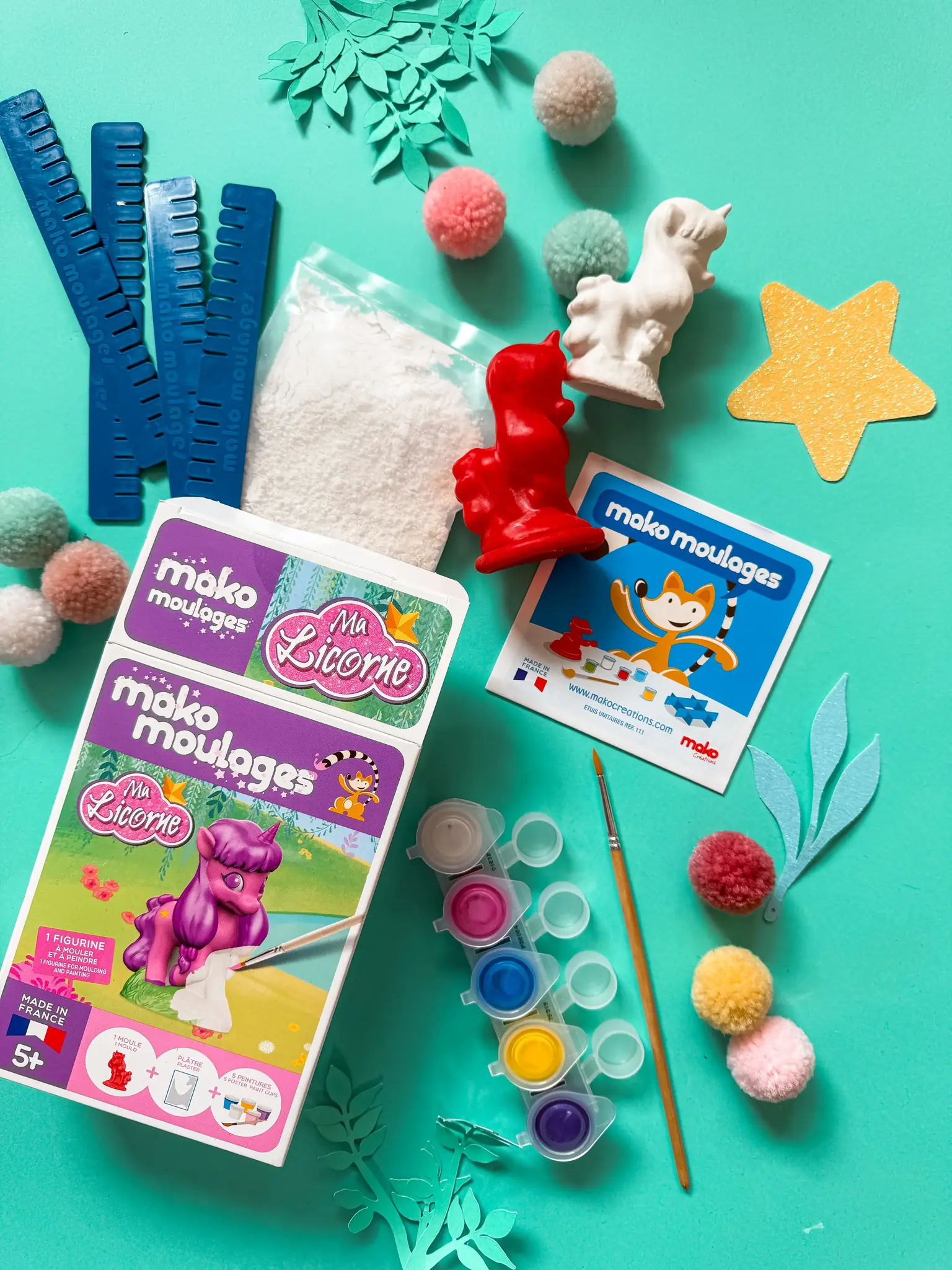 Met het Mako Moulages – Ma Licorne Étoile creatief‑kit maak je zelf een schattige eenhoorn‑figuur van gips. Meng het gips, giet het in de latexmal, laat het uitharden en schilder het daarna in betoverende kleuren. Een magisch knutselavontuur voor jonge creatievelingen.