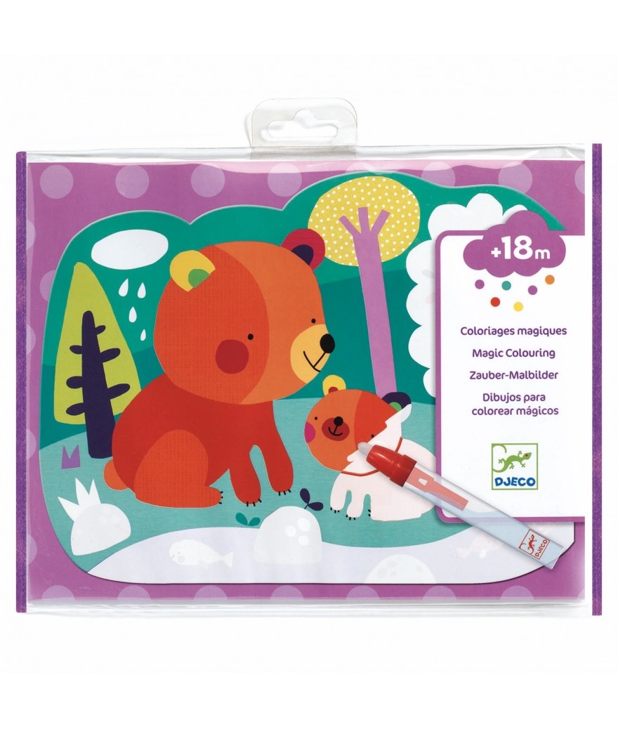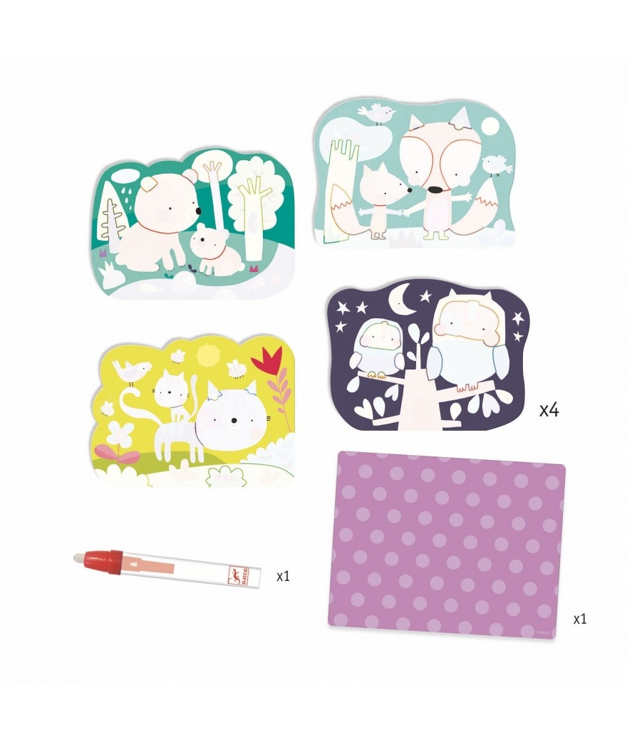 Inhoud: 4 kleurplaten van zacht plastic met een verdwijnend wit vlak, een watertankpotlood en een dikke kartonnen steun.