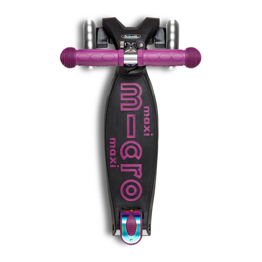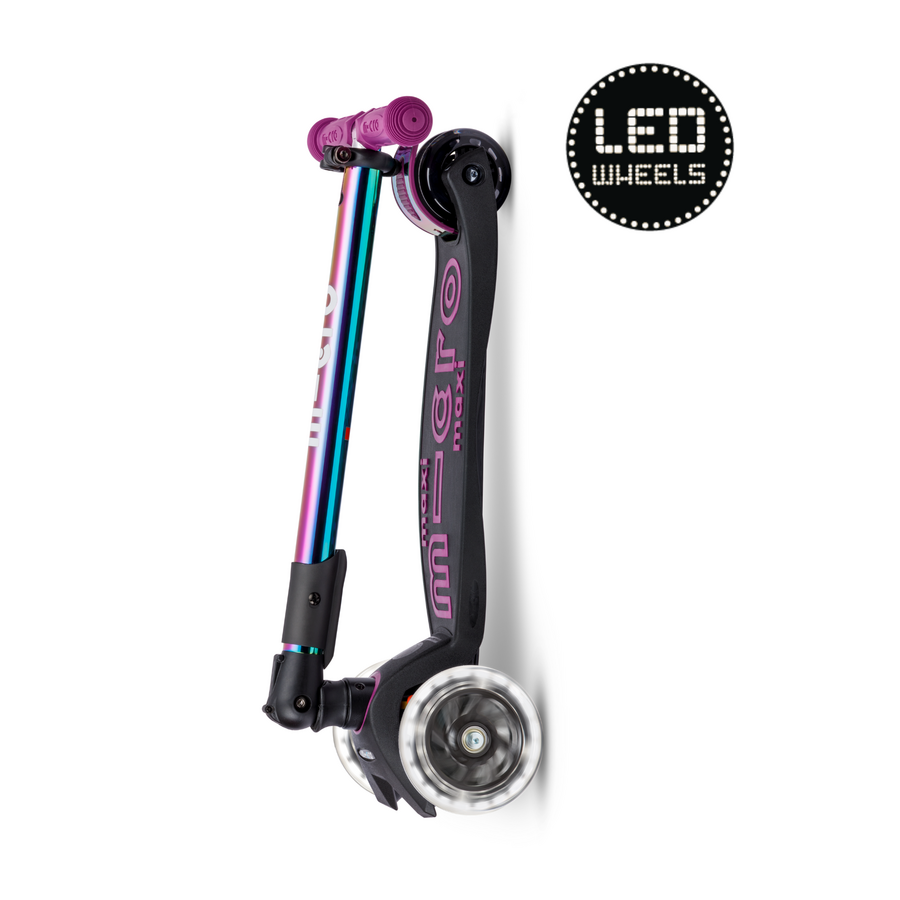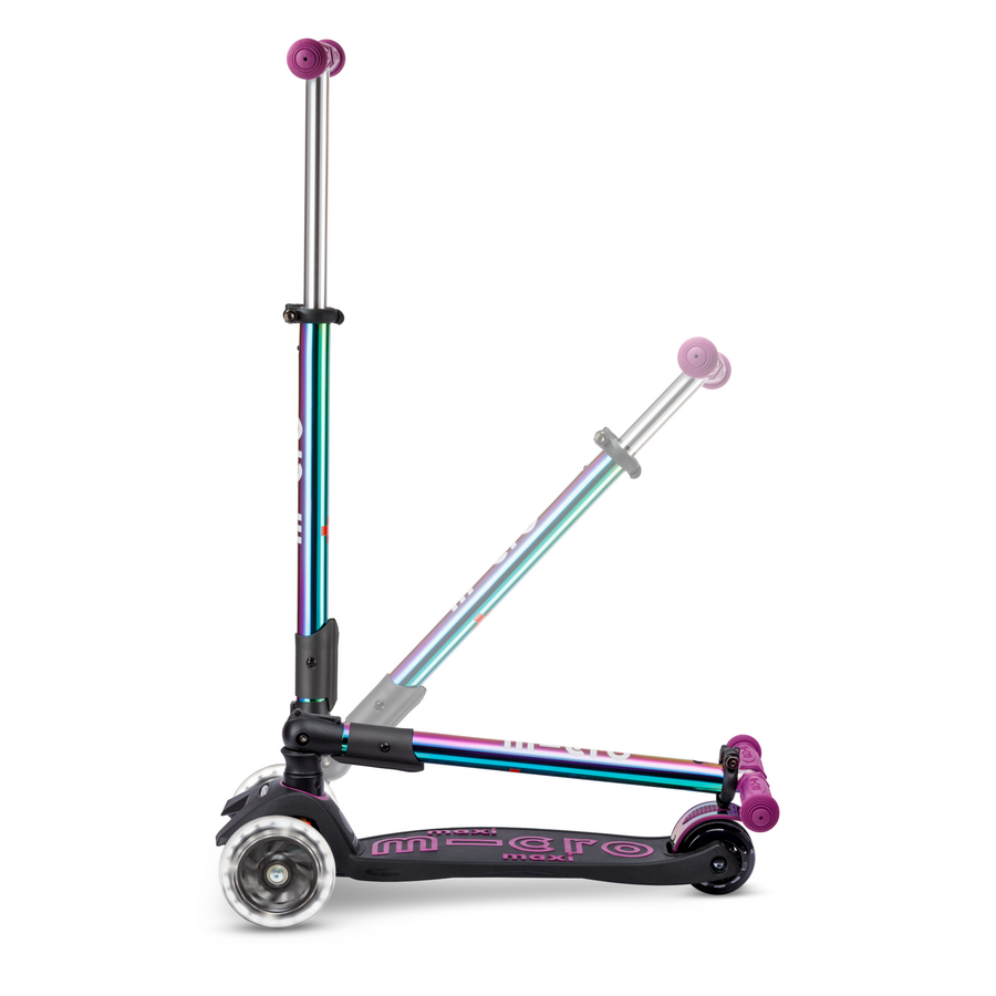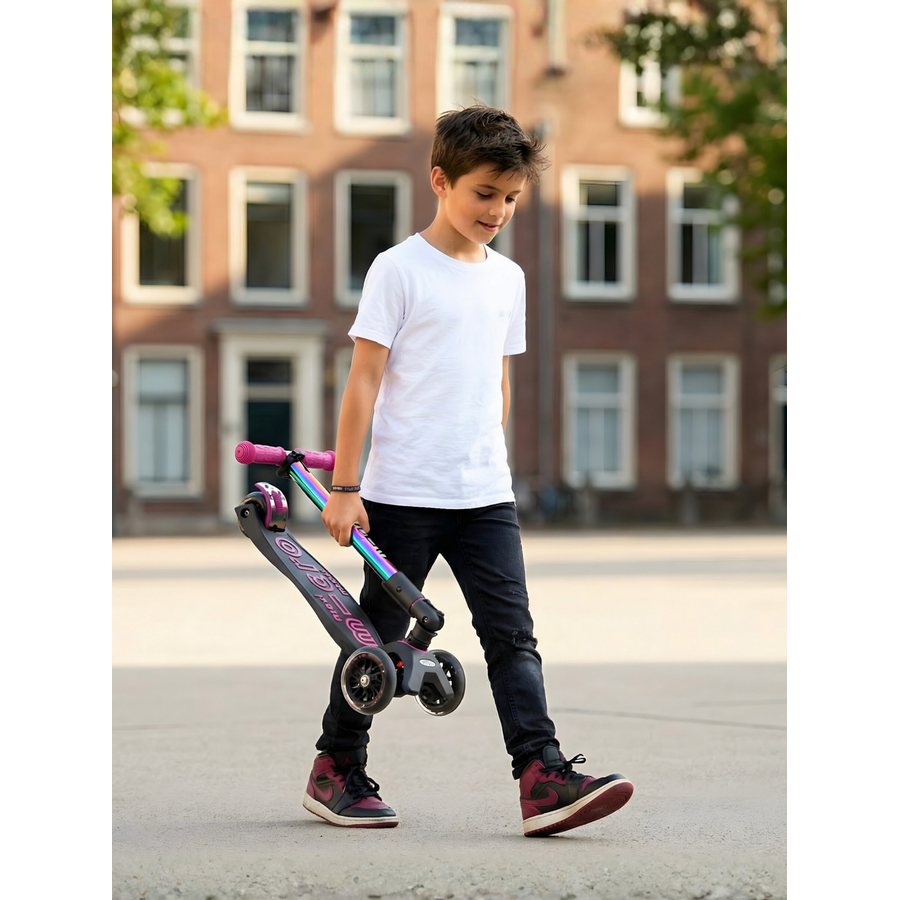 De Maxi Micro inklapbaar LED in Neochrome paars is een echte blikvanger voor kinderen vanaf 5 jaar. De bijzondere neochrome afwerking geeft de step een unieke, glanzende look die van kleur verandert in het licht. De LED-verlichting in de wielen zorgt niet alleen voor extra zichtbaarheid, maar maakt elke rit ook extra leuk. Dankzij het stevige frame, het verstelbare stuur en het inklapbare ontwerp is deze step veilig, comfortabel én praktisch voor dagelijks gebruik.
