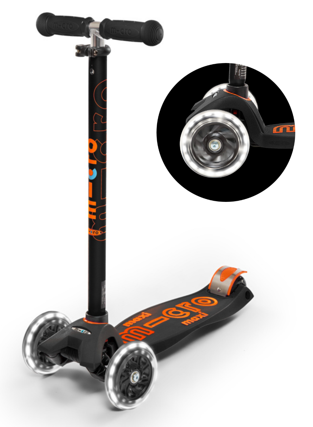 Deze zwarte Mini Micro Deluxe LED is extra veilig door zijn witte LED lampjes, zodat je kind 's avonds beter zichtbaar is. Kinderen vinden de lampjes natuurlijk vooral heel erg cool. De Mini Micro deLuxe lijn onderscheidt zich verder door het in hoogte verstelbare stuur en de geanodiseerde stuurstang in de kleur van het deck. Verkrijgbaar in veel spetterende kleurencombinaties!