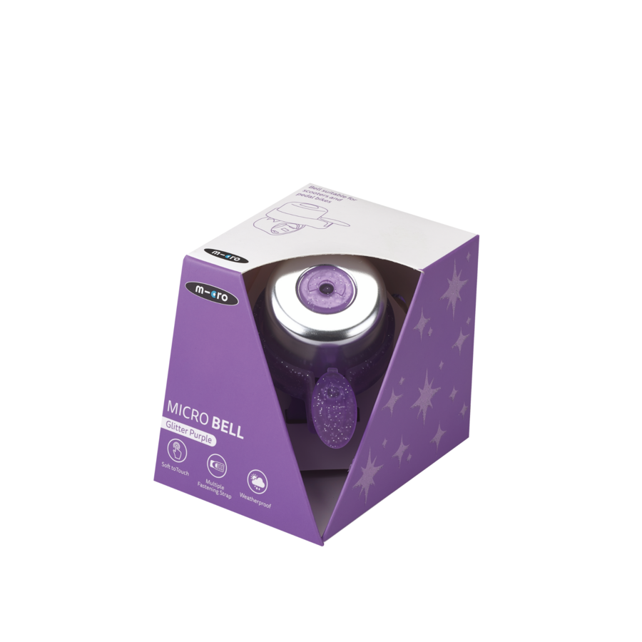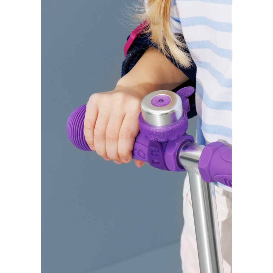 De paarse Micro Bel met glitters is een handig en veilig accessoire voor elke step en fiets. Deze weerbestendige bel is speciaal ontworpen om kinderen te helpen anderen te waarschuwen tijdens het steppen.