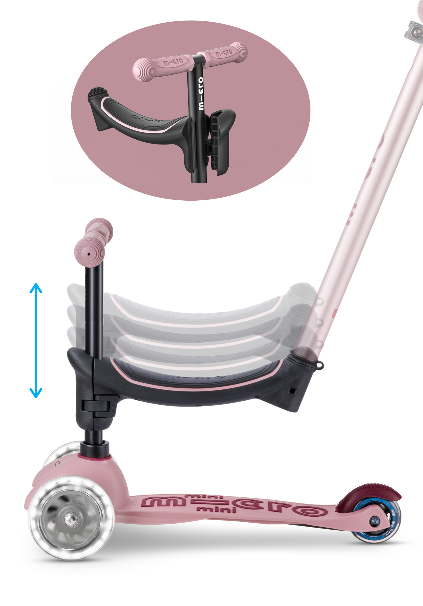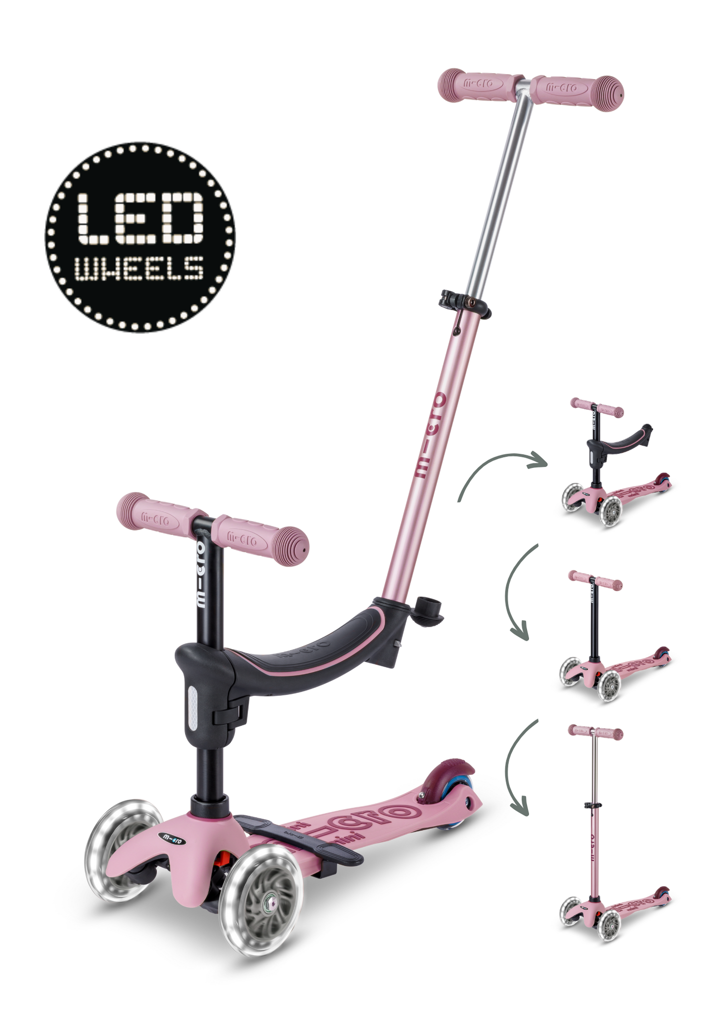 De Micro Mini2Grow 4in1 Step 2.0 LED in roze is de ultieme groeistep voor kinderen vanaf 1 jaar. Dankzij het innovatieve 4-in-1 ontwerp groeit deze step mee met je kind: van ride-on en driewieler to step, zodat je jarenlang plezier hebt van dezelfde step. De LED-verlichting in de wielen zorgt voor extra zichtbaarheid en maakt het rijden nog leuker. Het stevige frame en de verstelbare onderdelen bieden een veilige en comfortabele rit, geschikt voor de allerkleinsten én peuters die hun eerste steppogingen doen.