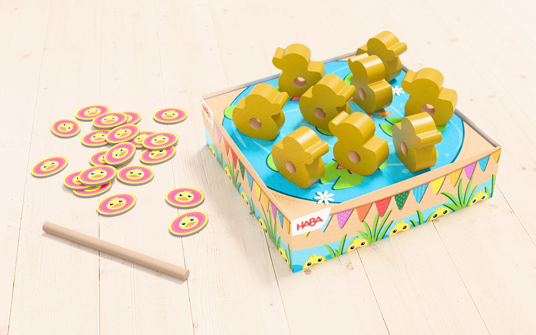 Vang de schattige eendjes! Bij het optillen kantelt de onderkant vanzelf omhoog. Als je een gekleurde stip ziet, krijg je een puntenkaartje. Wie de meeste kaartjes verzamelt, wint het spel. Dit is een perfect eerste regelspel voor peuters en kleuters: eenvoudig, duidelijk en vooral heel leuk. Ondertussen oefenen kinderen spelenderwijs hun oog-handcoördinatie en fijne motoriek. De onderdelen zijn stevig en ideaal voor kleine kinderhanden.