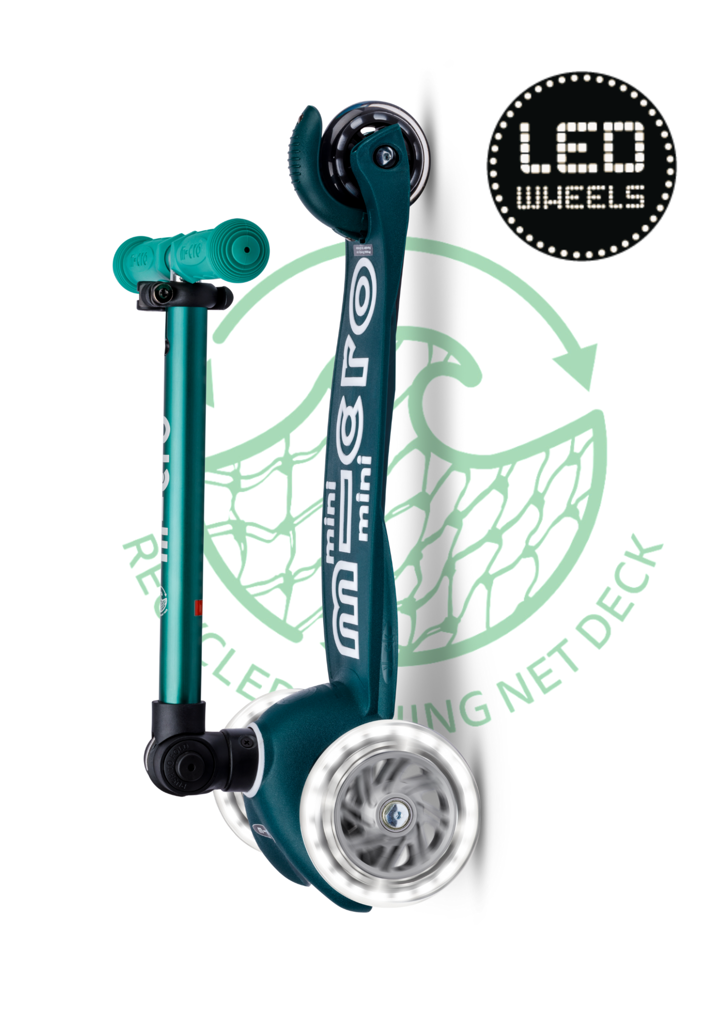 Het dek en de rem van deze step zijn gemaakt van gerecyclede visnetten. Elk jaar wordt er zo'n 640.000 ton aan visuitrusting in de oceanen achtergelaten. Micro pakt het probleem bij de bron aan en zamelt oude netten direct in bij de vissers. Het materiaal wordt gerecycled en hergebruikt voor onze duurzame ECO steps. Daarnaast doneert Micro 1% van de verkoop van de ECO-lijn aan milieuorganisaties.