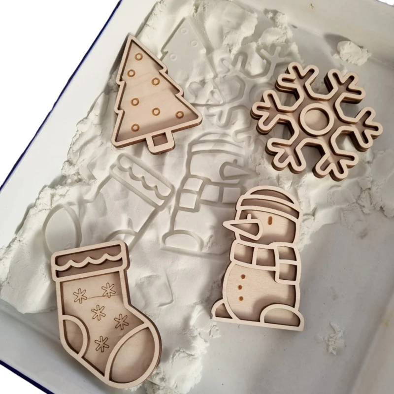 Vulvorm of speeltray in het thema winter. Met een sneeuwpop, sneeuwvlok, kerstboom en kerst sok. Perfect te vullen met droge items zoals speelrijst / speelparels. In een lekker klein en handig formaatje.