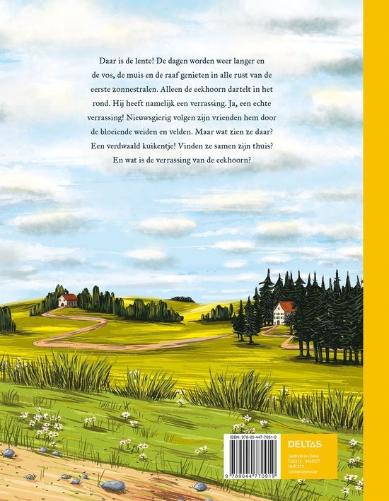 Daar is de lente! De dagen worden weer langer en de vos, de muis en de raaf genieten in alle rust van de eerste zonnestralen. Alleen de eekhoorn dartelt in het rond. Hij heeft namelijk een verrassing. Ja, een echte verrassing! Nieuwsgierig volgen zijn vrienden hem door de bloeiende weiden en velden. Maar wat zien ze daar? Een verdwaald kuikentje! Vinden ze samen zijn thuis? En wat is de verrassing van de eekhoorn?