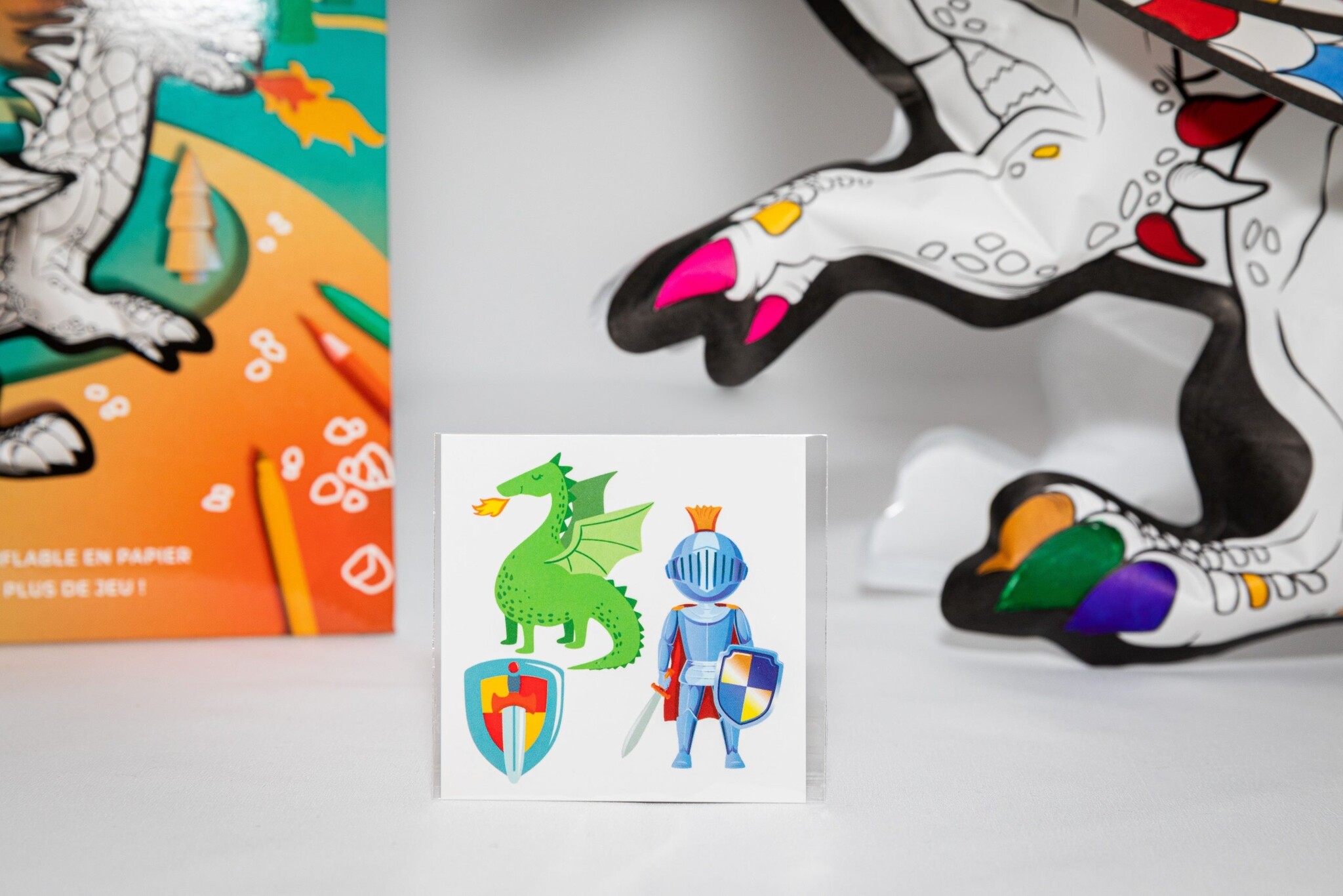 Ontdek de gigantische draak, een opblaasbare kleurplaat die kids onderdompelt in een denkbeeldige wereld vol magie en avontuur. Ze krijgen het genoegen om een angstaanjagende draak in te kleuren wiens enige missie het is om een kasteel aan te vallen dat wordt verdedigd door een dappere ridder.