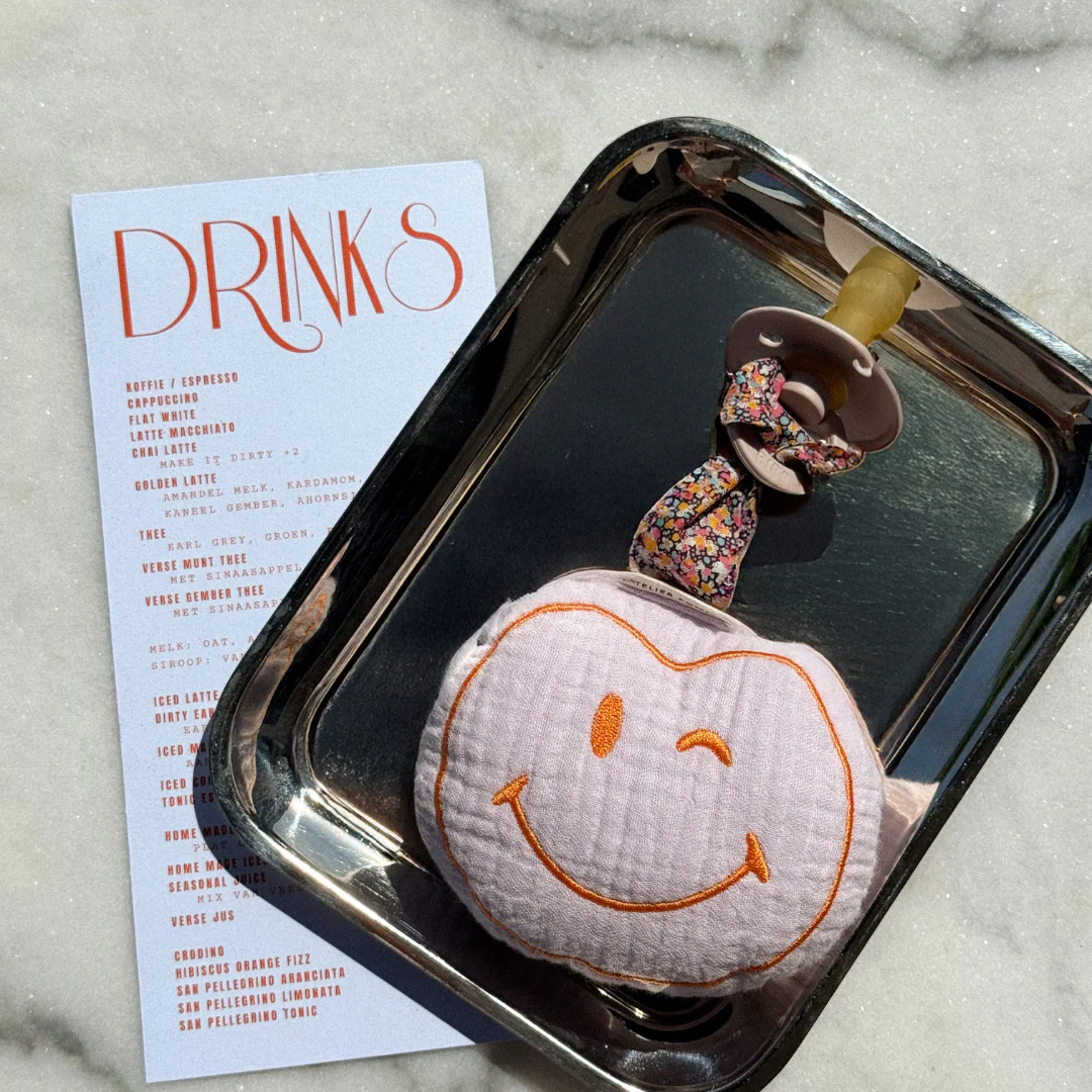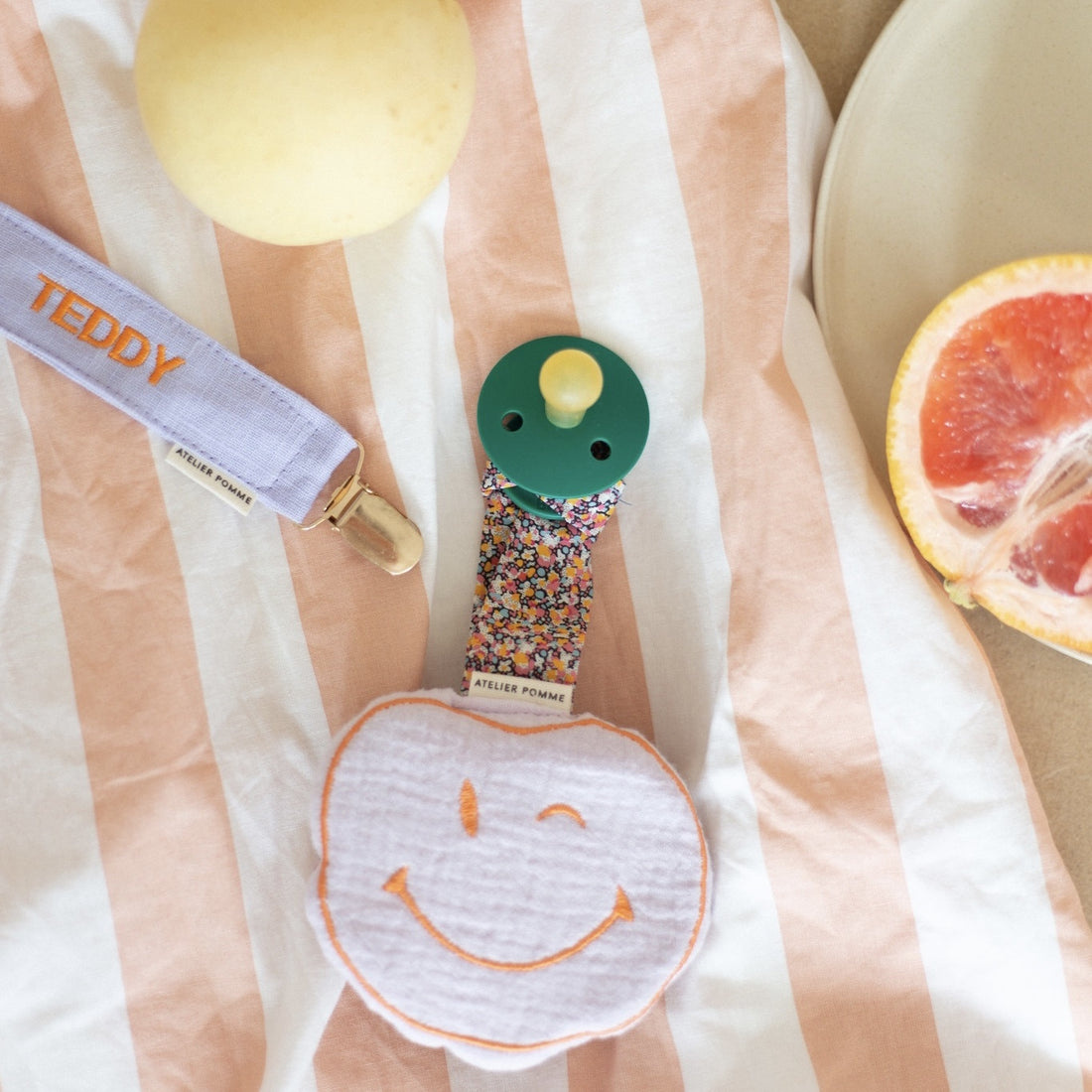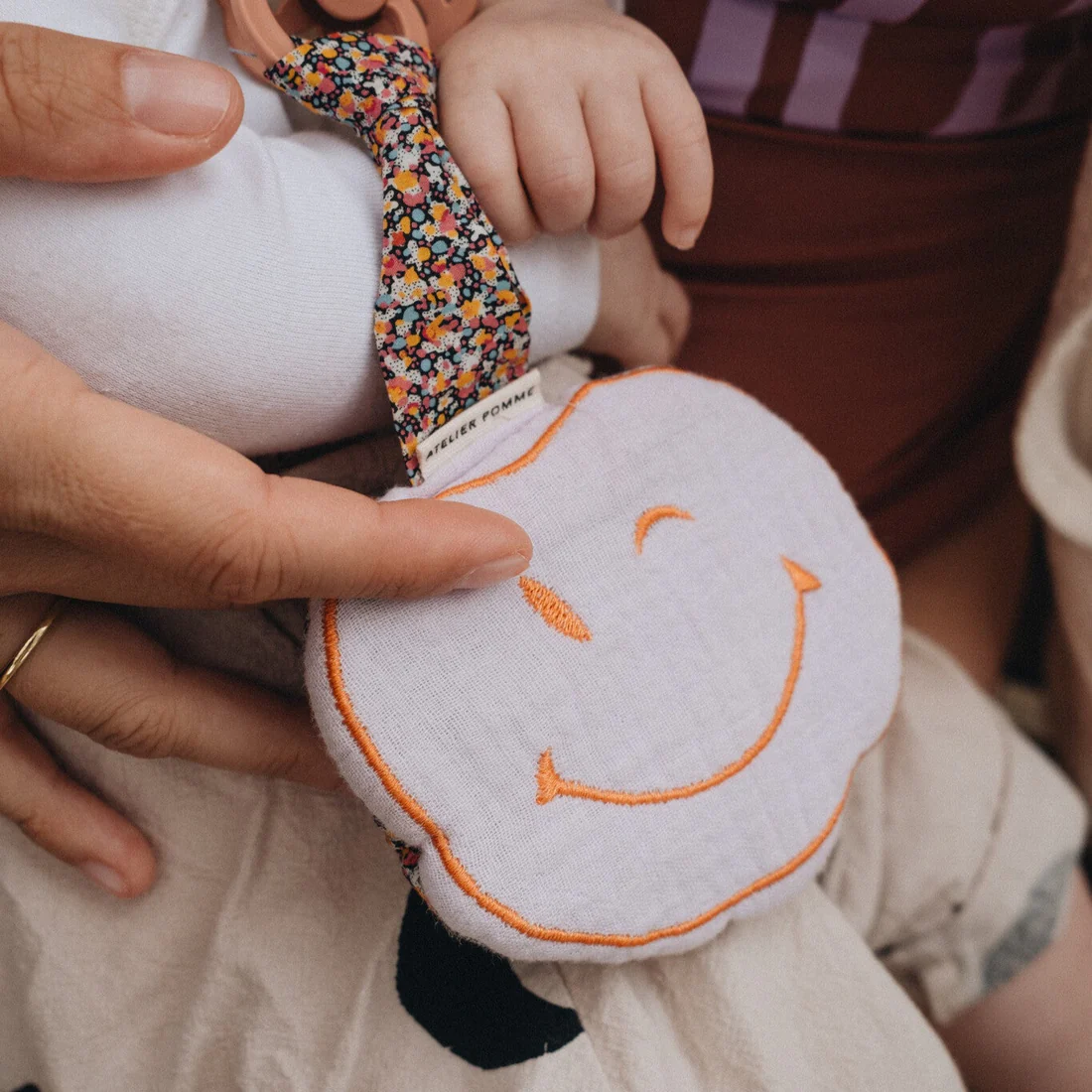 Hi, mini favorite! De schattige appel is de POMME CUDDLE, een lieve smiley die de speen van je kleintje bewaakt. De knuffel is gemaakt van superzachte mousseline en heeft een koordje waaraan je een speen kunt bevestigen. POMME CUDDLE knuffelt ook graag met je baby. POMME is verkrijgbaar in verschillende vrolijke kleuren met een schattige print op de achterkant!