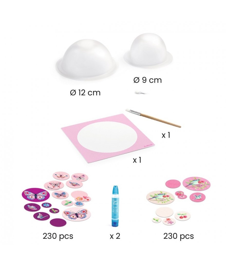 Inhoud: 2 kommetjes (2 afmetingen: 9 x 5,5 cm / 12 x 6 cm), 2 tubes vloeibare lijm, 1 bakje, 1 borstelkwast, grote geïllustreerde confetti van papier, 1 blad met gedetailleerd stappenplan