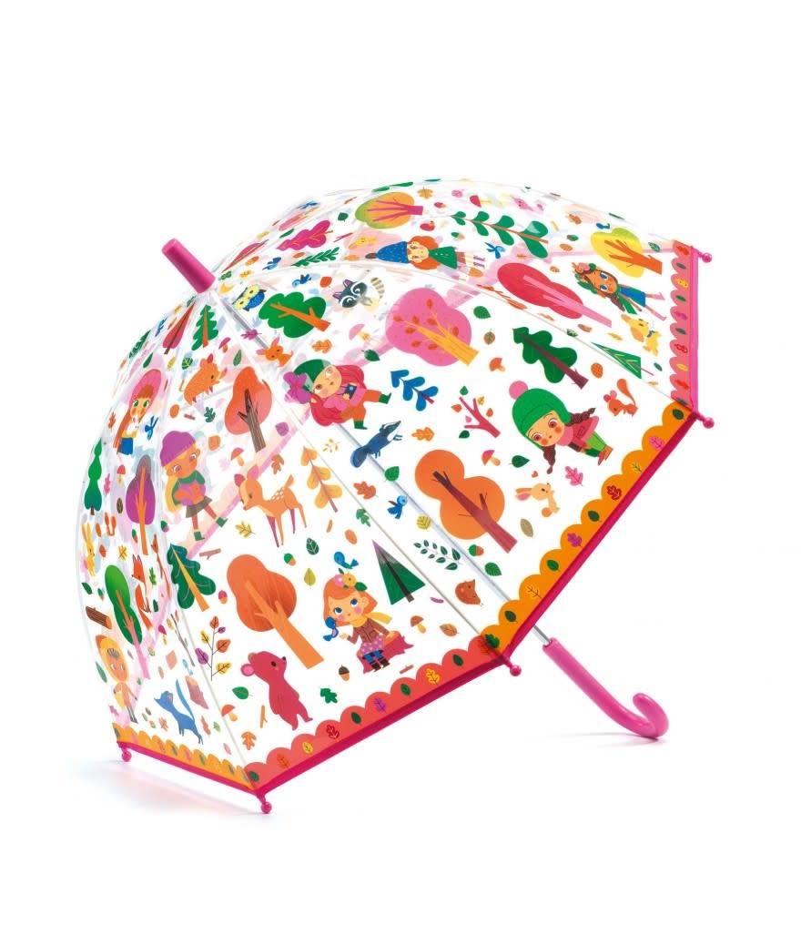 Een felgekleurde paraplu met bosthema. Dankzij de doorzichtigheid kan je kind zien waar het loopt en dankzij de handmatige opening met beveiligingssysteem kan het worden geopend en gesloten zonder de vingers af te knellen. Een kleurrijk accessoire, ideaal om uitstapjes in de regen op te vrolijken!