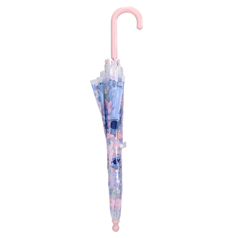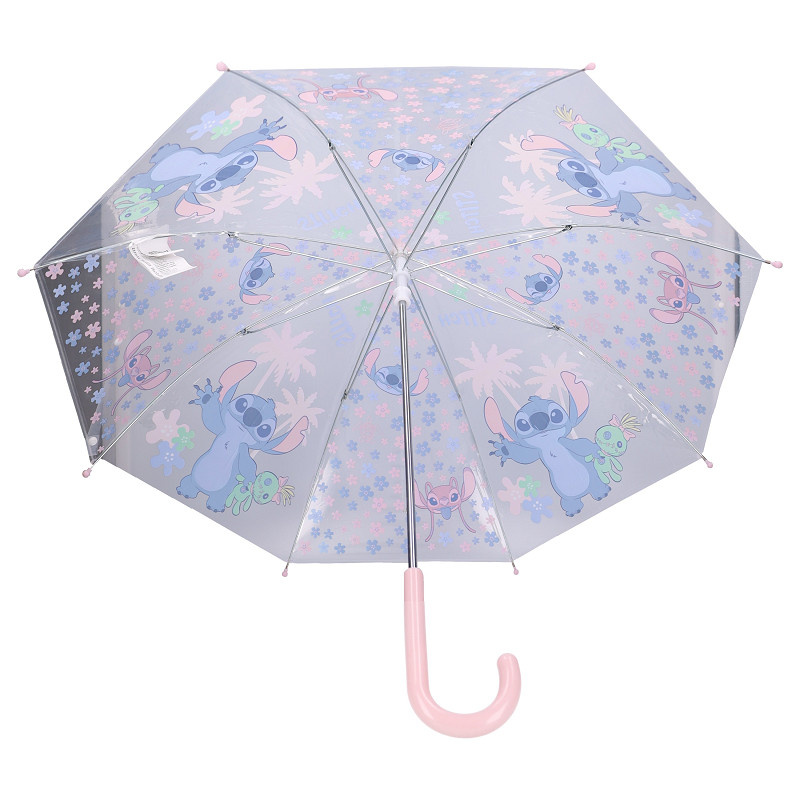 Met deze vrolijke paraplu van Stitch uit de ‘Rainy Days’ collectie, wordt in de regen lopen een echt feestje! De paraplu is uitgevoerd in transparante banen en voorzien van een schattige Stitch-print. Het ronde handvat ligt comfortabel in de kinderhand en dankzij de lichte constructie is de paraplu eenvoudig zelf open en dicht te klappen. De dopjes aan het uiteinde van de baleinen zorgen ervoor dat je kindje zich niet kan bezeren. Praktisch, veilig én super leuk, perfect voor elke kleine Stitch-fan!