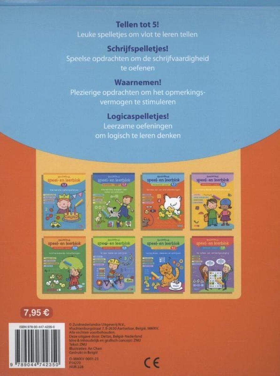 Dit educatieve boek biedt diverse activiteiten om verschillende vaardigheden te ontwikkelen: - Tellen tot 5: Leuke spelletjes om vlot te leren tellen. - Schrijfoefeningen: Speelse opdrachten om de schrijfvaardigheid te oefenen. - Letters herkennen: Leerzame oefeningen om kennis te maken met de letters van het alfabet.