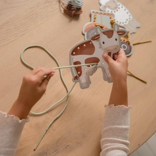 Kom, kies een kaart en begin te rijgen! Volg het patroon van de leuke figuren. Haal de veter door de kleine gaatjes om wat details toe te voegen aan de boerderij, of aan de tractor. Rijg langs de kip, de koe en het schaap. Een leuke en vermakelijke activiteit. Deze set rijgkaarten wordt geleverd met twee veters en 5 kartonnen kaarten voorzien van de prachtige illustraties van de Little Farm collectie. Peuters zullen het geweldig vinden om hun fijne motoriek te oefenen door de veter met veel precisie door de kleine gaatjes van de kaarten te rijgen. Uren speelplezier gegarandeerd!