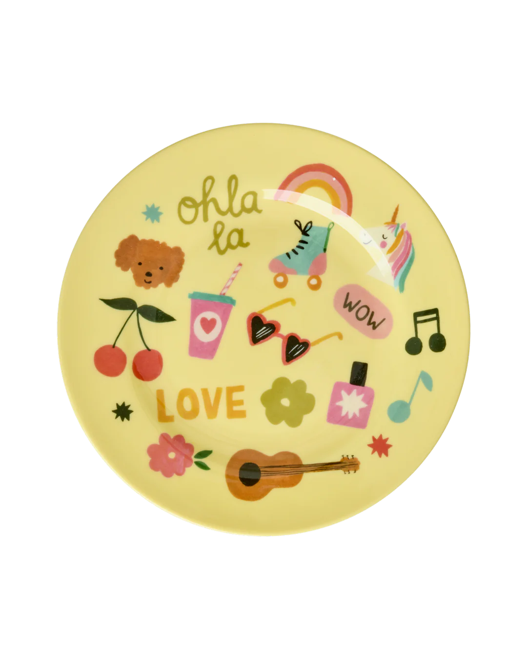 Rond melamine kinderbord – Zachtgeel unicorn love print