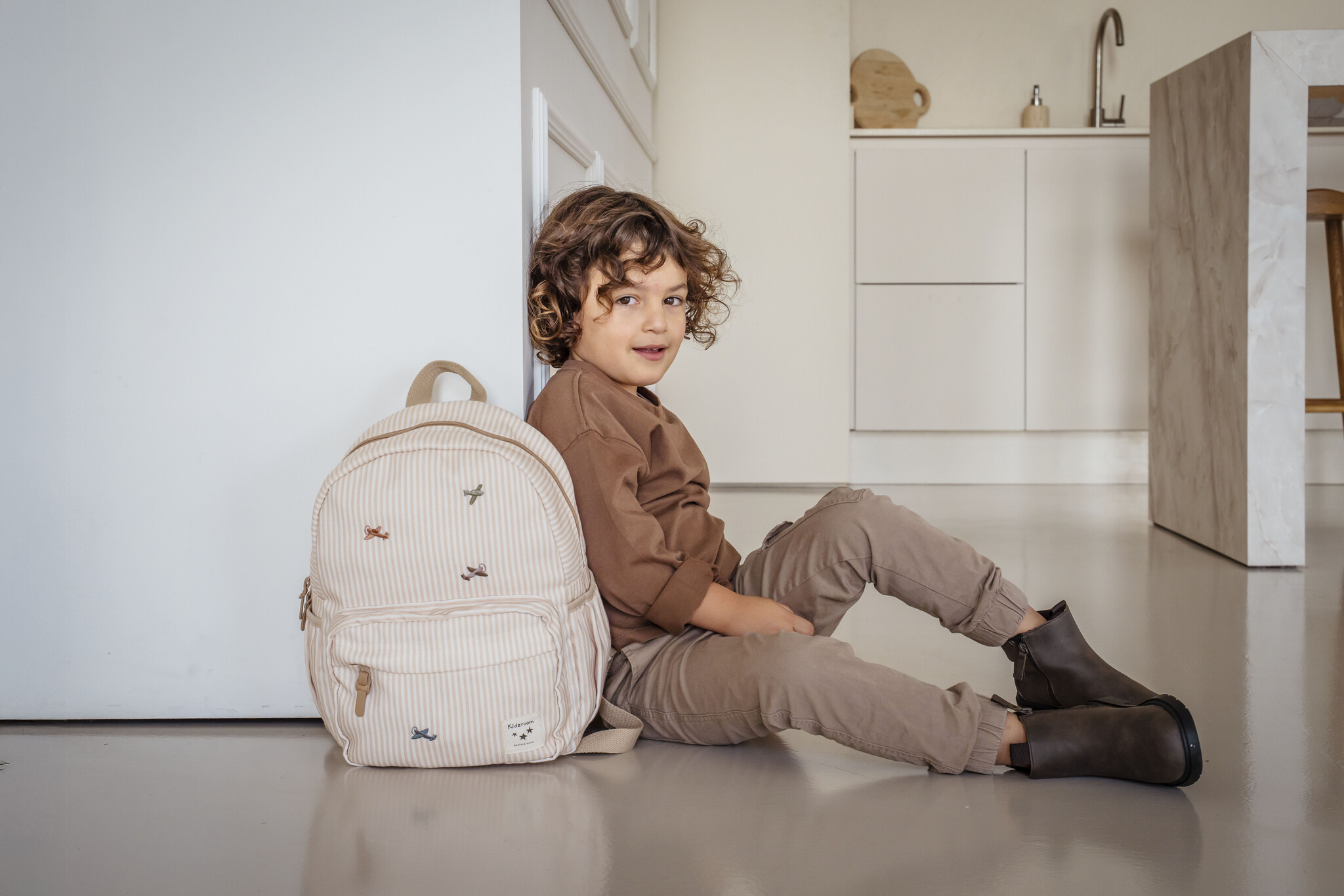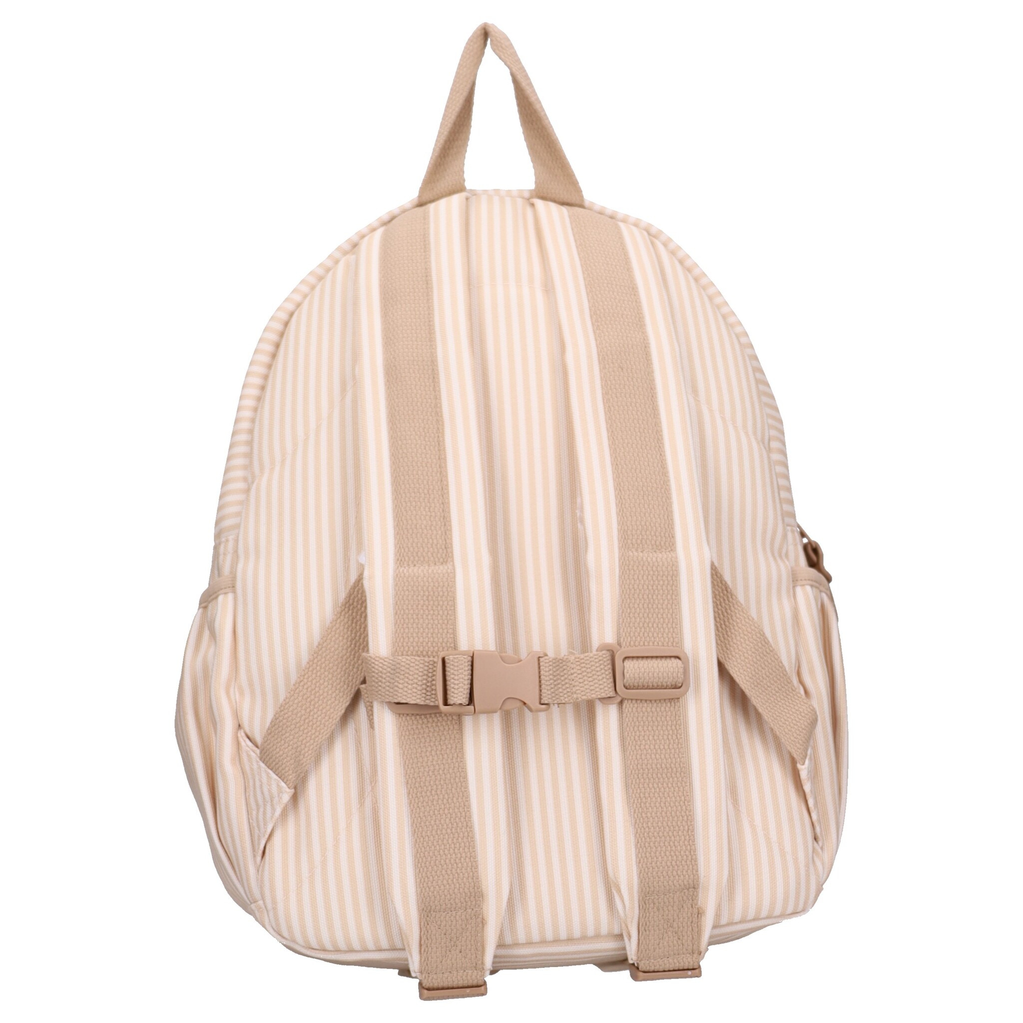 Deze leuke beige rugzak uit de Nostalgia-collectie is perfect voor elk avontuur en een echte must-have voor je kindje. De tas is gemaakt van gerecycled polyester en vrolijk versierd met een all-over strepenprint met vliegtuigjes. Het ruime hoofdvak met dubbele rits biedt voldoende ruimte voor een broodtrommel, drinkfles, een extra setje kleding en beschikt over een praktisch voorvak met rits voor kleine spulletjes. Ideaal voor naar school of een dagje uit! De rugzak kan gedragen worden aan de stevige lus aan de bovenzijde of comfortabel op de rug met de verstelbare schouderbanden. Dankzij de handige gespen op de schouderbanden blijft de tas altijd stevig en prettig zitten. Binnenin is de rugzak voorzien van een naamlabel en een houder voor een drinkfles, zodat alles netjes op zijn plek blijft. Een vrolijke en praktische rugzak waar je kindje veel plezier van zal hebben!