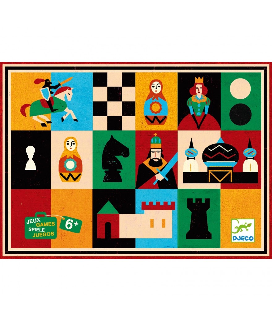 Schaak- en damspel in één! Het spel bestaat uit een dubbelzijdig speelbord, 32 schaakstukken en 40 houten dammen.