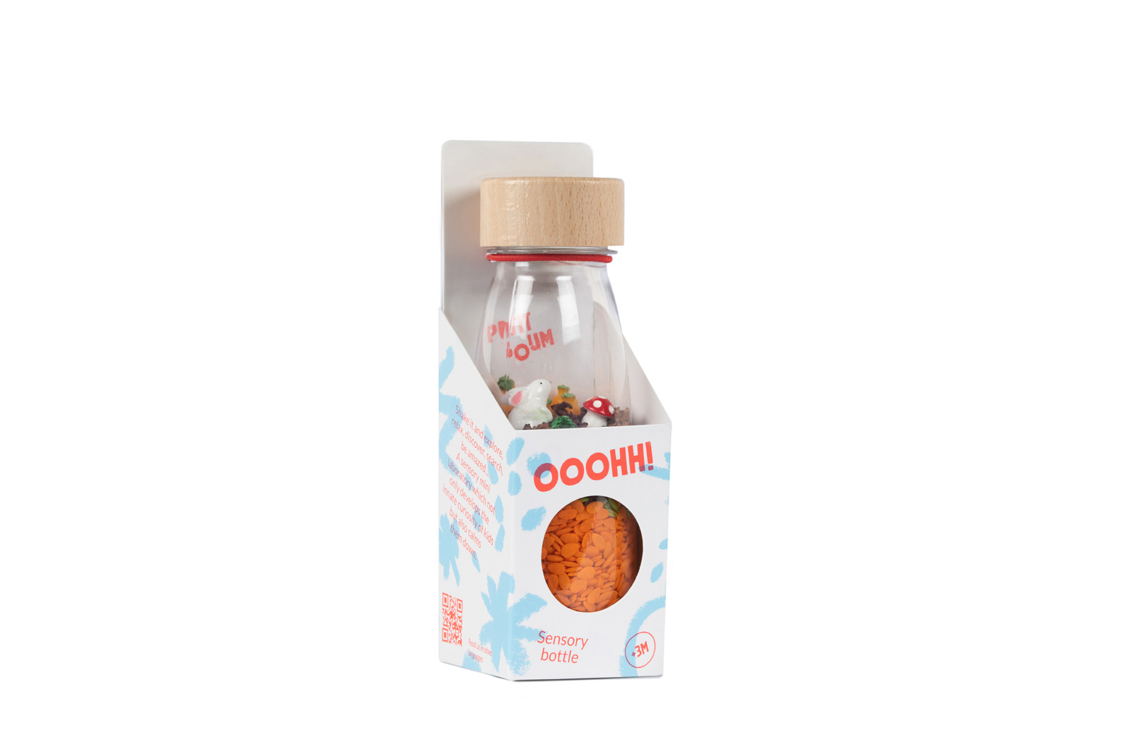 Kijk, zwaai en luister! Stimuleer het gehoor. Stimuleer zicht. Stimuleer aanraking. Klankflessen, een klank- en kleurrijke wereld binnen handbereik. Spelideeën: 1. Observeer de elementen. 2. Schud het en raad de geluiden van elk element. 3. Stapel flessen op elkaar. 4. Rol de fles.