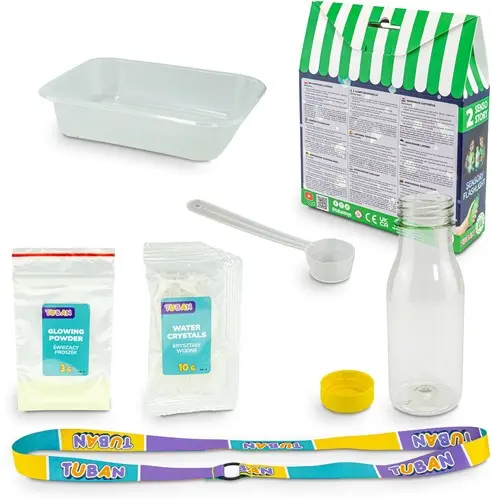 De set bevat een flesje, maatbeker, glow-in-the-dark poeder, water kristallen, bandje en kom.