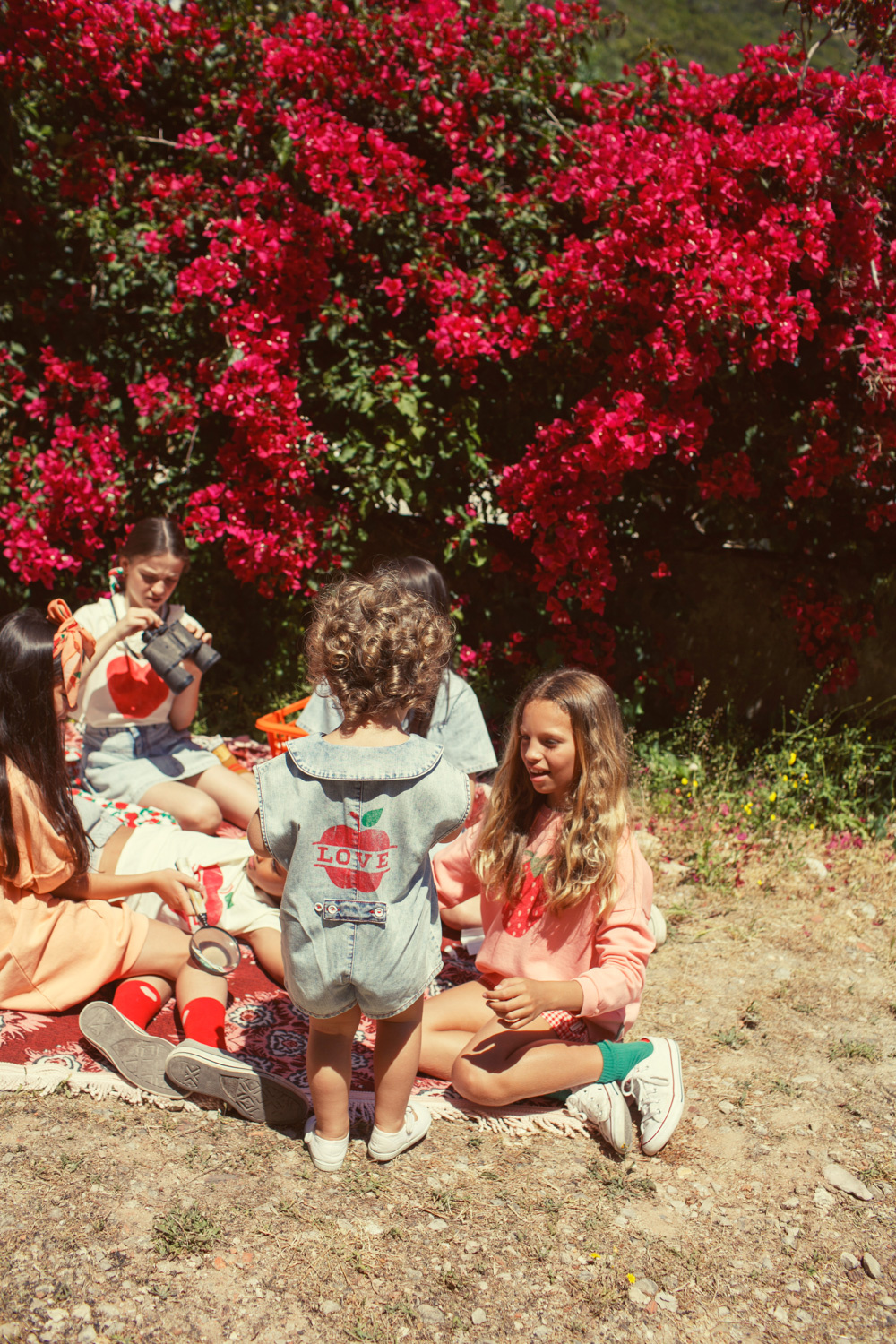 Recente artikelenBekijk productPiupiuchickShort sleeveless jumpsuit - Blue light denim w/ apple print€80,99