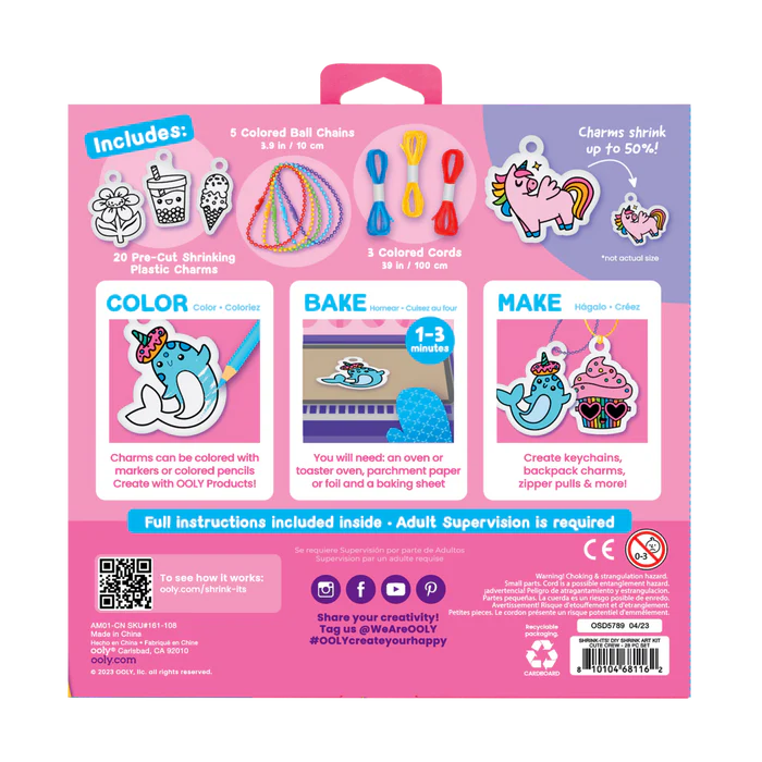 Gebruik stiften of kleurpotloden om één (of alle) van de 20 bedels in te kleuren, kijk vervolgens hoe ze krimpen terwijl ze in de oven bakken en plaats ze ten slotte aan een van de meegeleverde koorden of bolletjeskettingen.