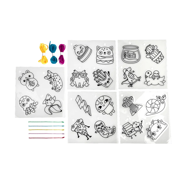 Gebruik stiften of kleurpotloden om één (of alle) van de 20 bedels in te kleuren, kijk vervolgens hoe ze krimpen terwijl ze in de oven bakken en plaats ze ten slotte aan een van de meegeleverde koorden of bolletjeskettingen.