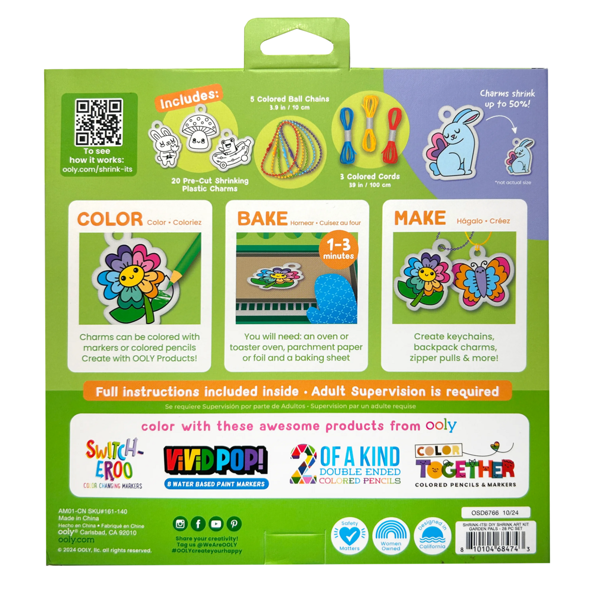 Maak je klaar om te kleuren, bakken en krimpen tot je mooiste bedeltjes met de Shrink-its! DIY Krimpkunstset - Garden Pals! Deze knutselset voor kinderen zit boordevol 20 schattige ontwerpen met een tuinthema en transformeert konijntjes, bijen, bloemen en meer in piepkleine schatten die je kunt dragen of delen. Of je knutselende kind nu armbanden, sleutelhangers of rugzakbedeltjes personaliseert, deze set bruist van de mogelijkheden.